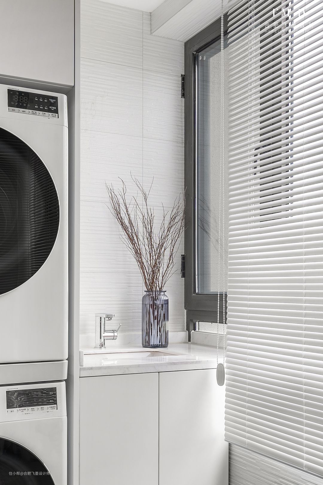 阳台与餐厅相邻,用大面积玻璃门作为隔断,不影响空间采光,又保留独立功能;打开窗户,晚风可无阻碍的进入室内;洗衣机+烘干机的模式,科技生活,减少晾晒空间,给生活增添便捷度。