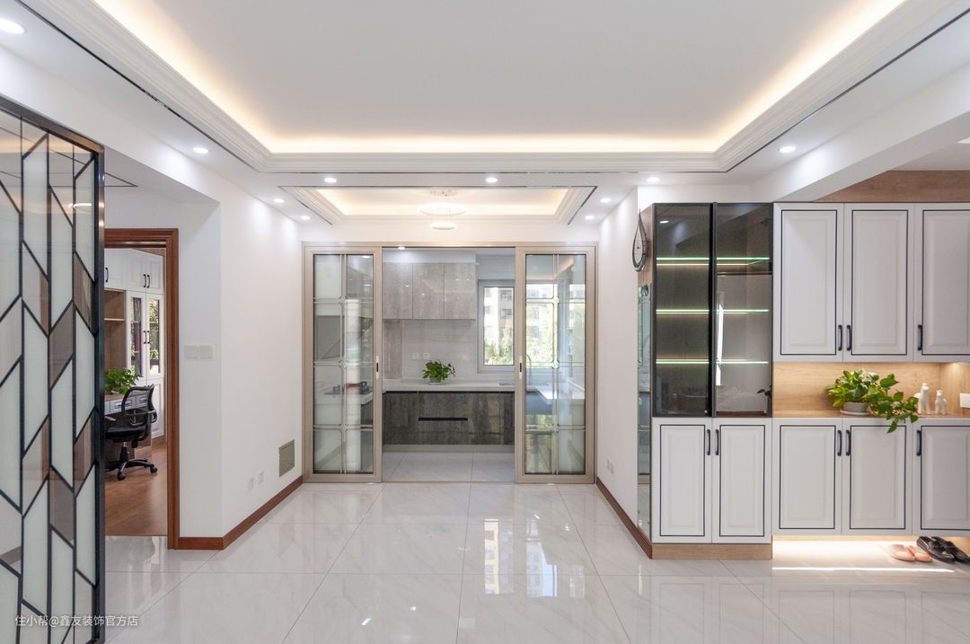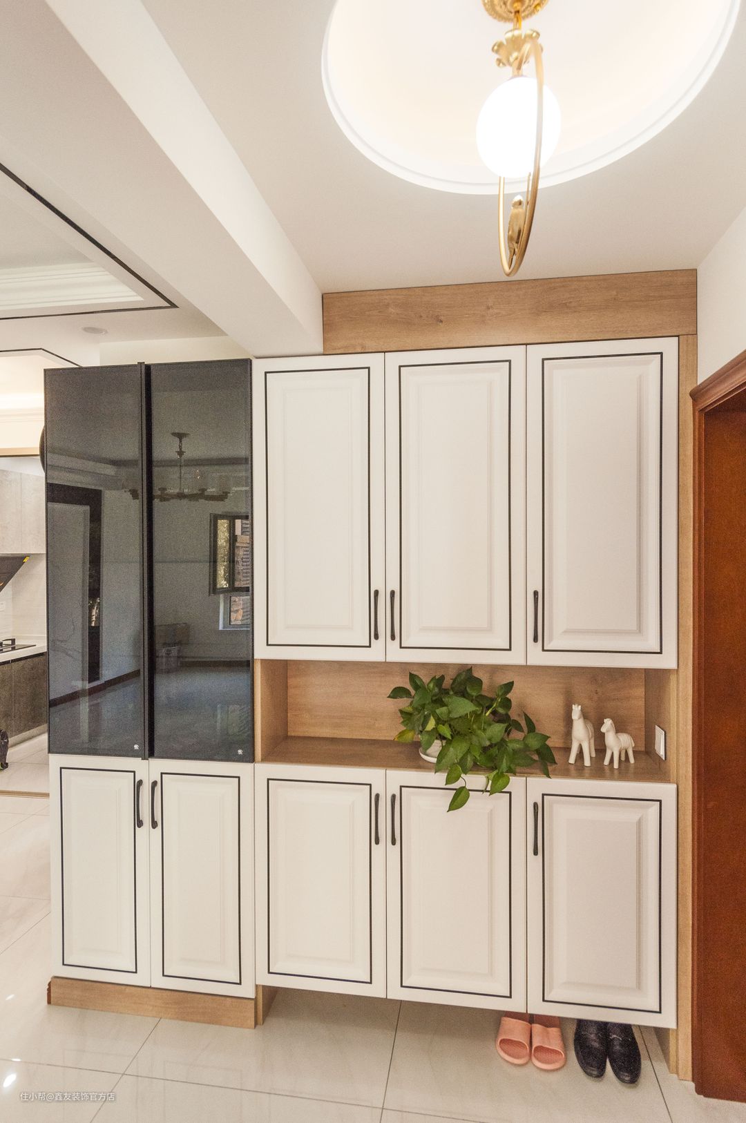 入户右边定制通顶鞋柜,一看就是高端大气上档次,业主好大哥的品味。整体白色为主搭配黑色透明玻璃,与地面瓷砖相呼应。柜体下方悬空,平时放经常穿的鞋出入非常方便。中间置物处可以放一些绿植和随身物品。设置灯带,增加层次感的同时,也方便使用。
