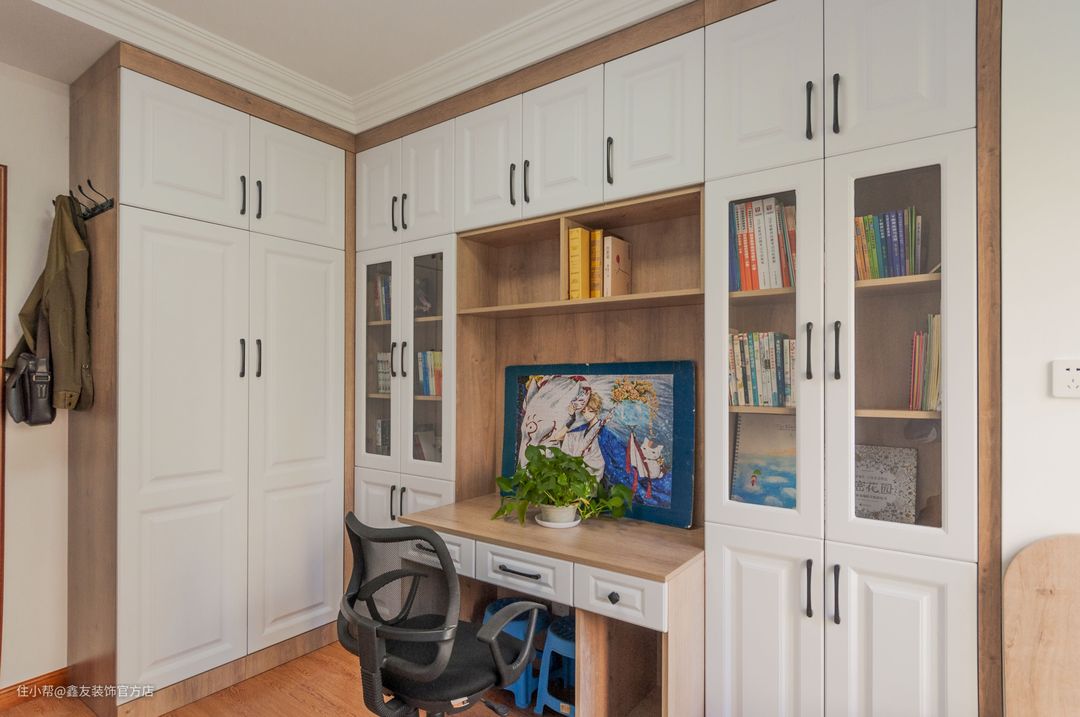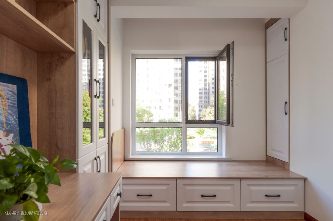 书房白色柜体搭配原木色,飘窗柜体利用,整体空间干净整洁,非常实用,没有一丝多余的空间。