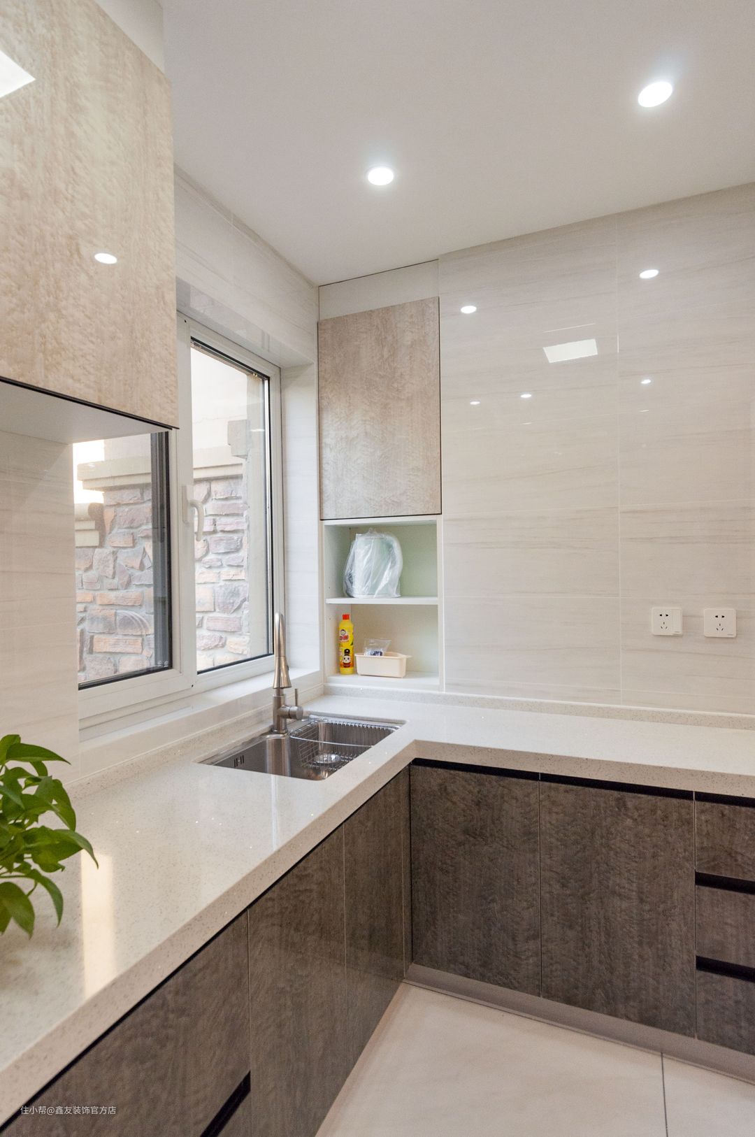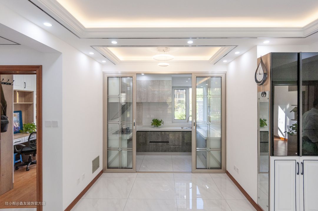厨房颜色统一,推拉门采用金属边框搭配浅色系大理石柜面台面,整个厨房空间更上一个层次。U型橱柜,满足洗切炒放拿顺序,做饭的动线更加流畅自然。