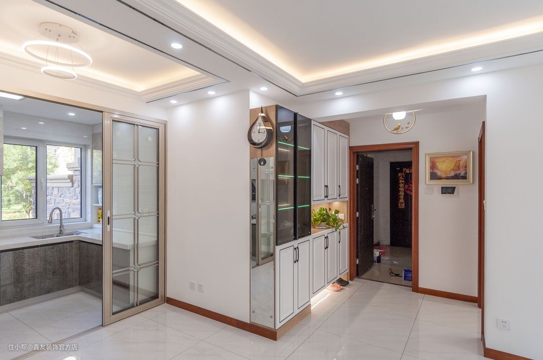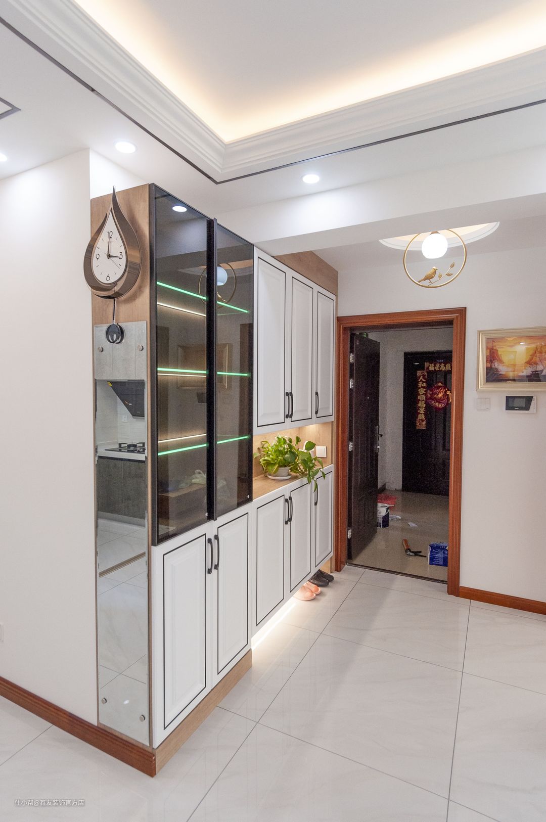 入户右边定制通顶鞋柜,一看就是高端大气上档次,业主好大哥的品味。整体白色为主搭配黑色透明玻璃,与地面瓷砖相呼应。柜体下方悬空,平时放经常穿的鞋出入非常方便。中间置物处可以放一些绿植和随身物品。设置灯带,增加层次感的同时,也方便使用。