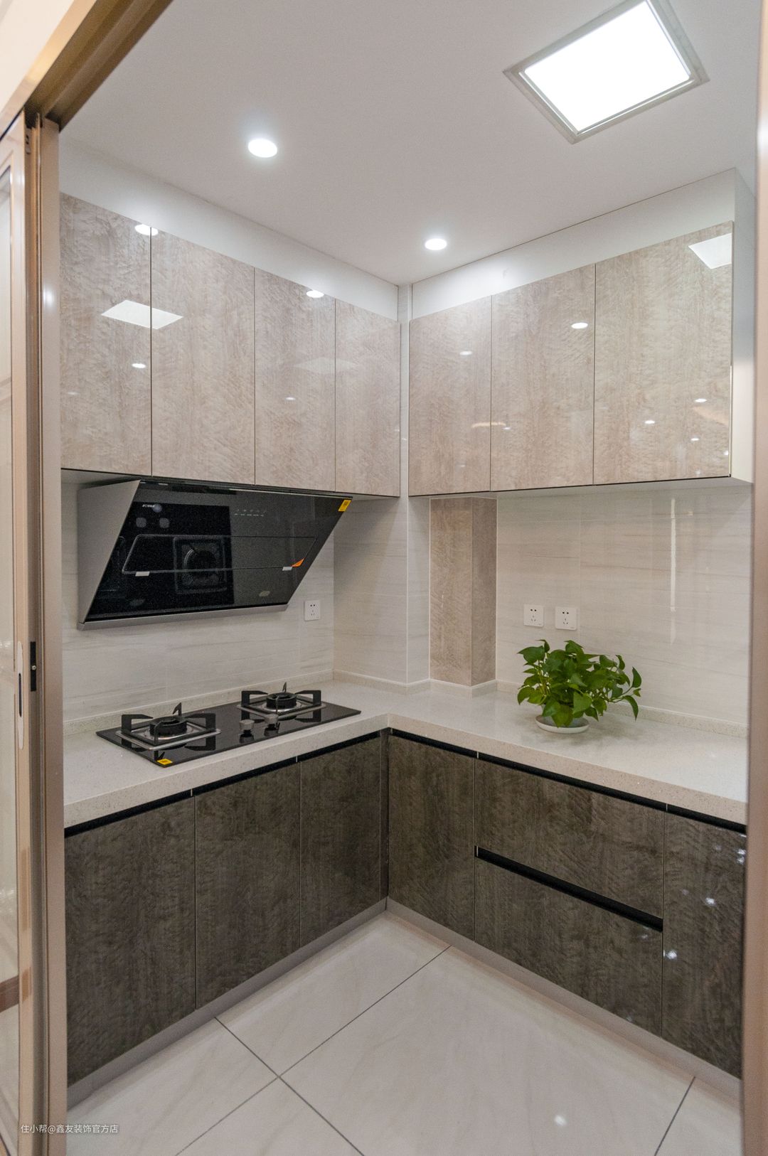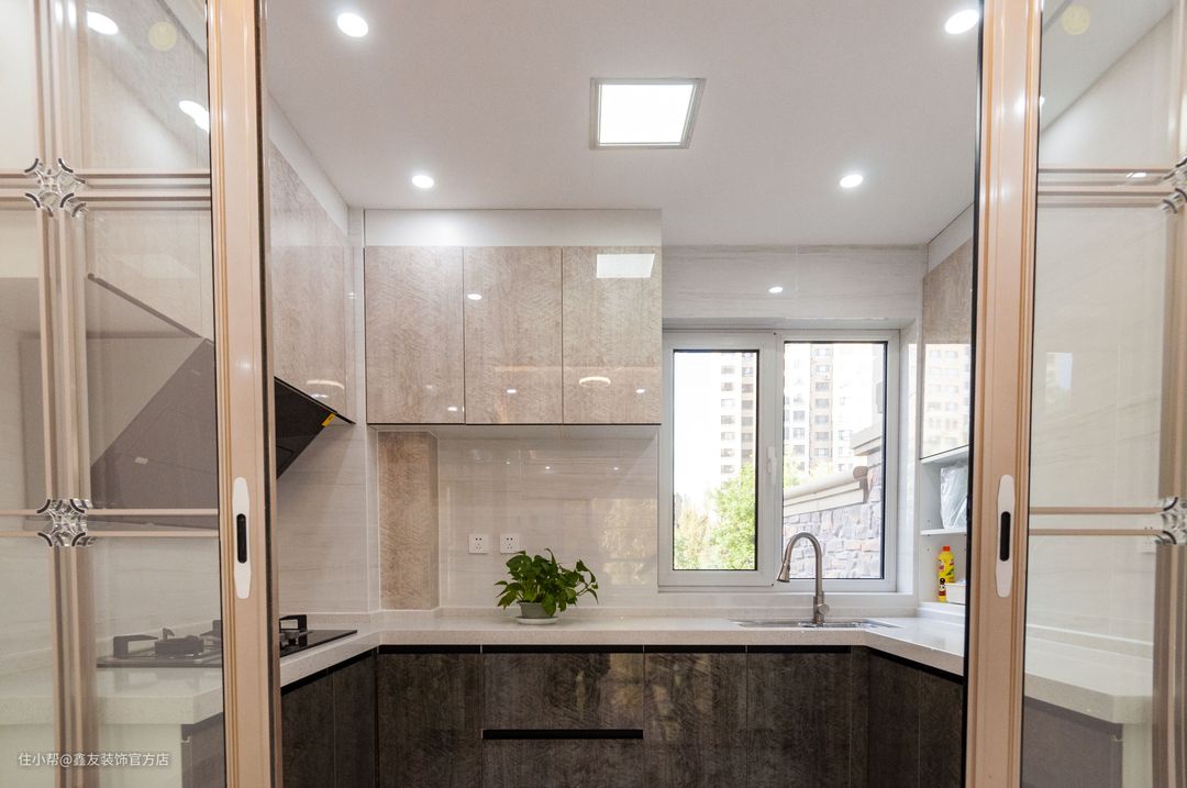 厨房颜色统一,推拉门采用金属边框搭配浅色系大理石柜面台面,整个厨房空间更上一个层次。U型橱柜,满足洗切炒放拿顺序,做饭的动线更加流畅自然。