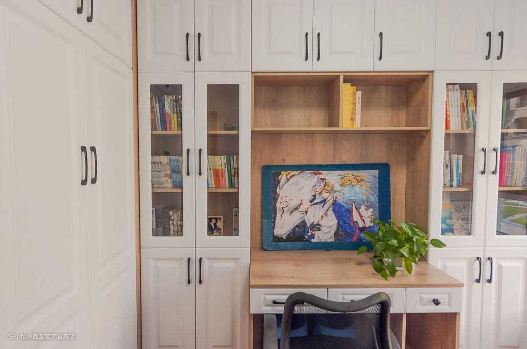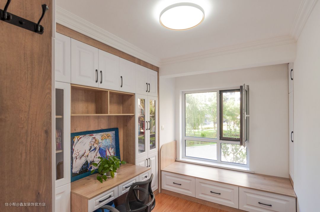 书房白色柜体搭配原木色,飘窗柜体利用,整体空间干净整洁,非常实用,没有一丝多余的空间。
