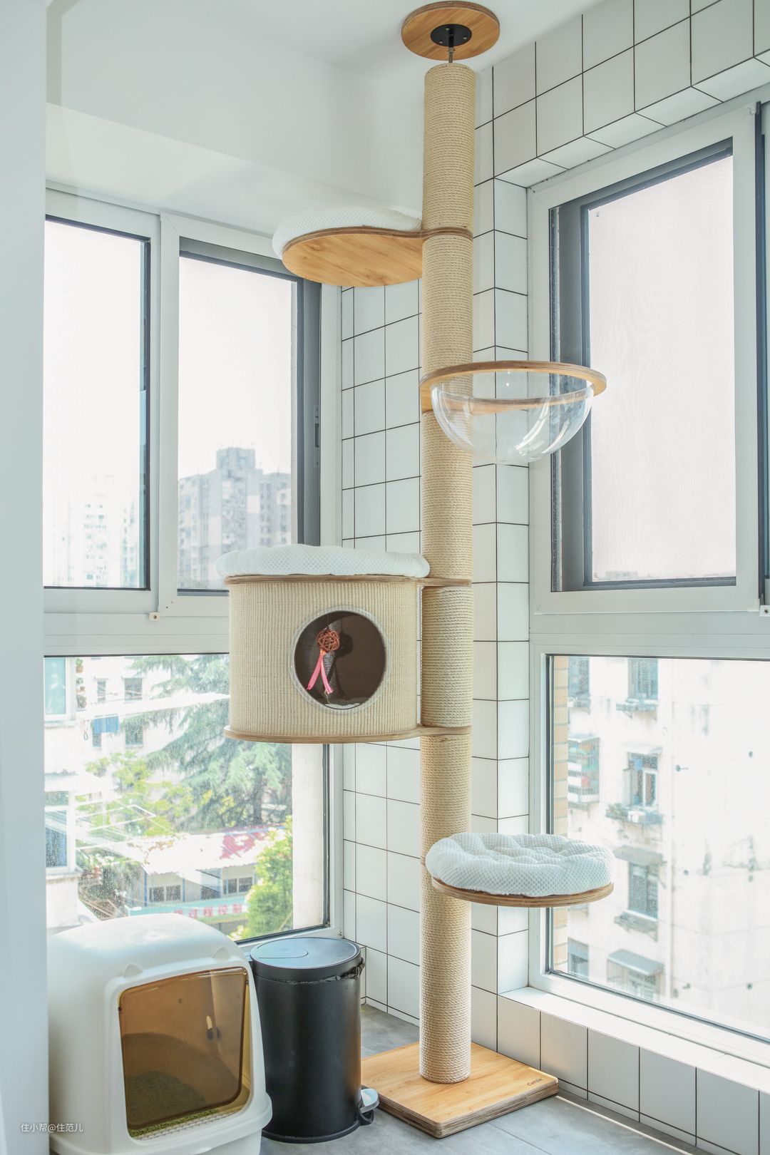 猫爬架和猫砂盆占据阳台一角,通透的视野让这里成为猫猫最爱待的地方。