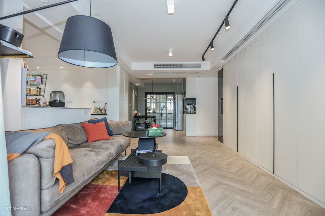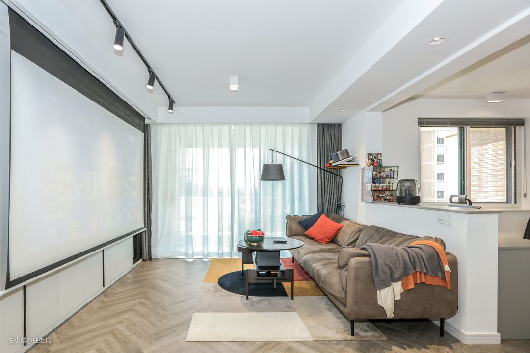 客厅在结构和布局上没有做太大的改动,主要是把相邻的次卧打通,让客厅在横向和纵向视觉上都更加开阔。 优先考虑到收纳,设计了一整面墙的定制柜;再从生活习惯出发,小两口不经常看电视,再加上老人暂时不同住,客厅没有安装电视,直接预留的极米投影仪。 用作点缀的地毯,和沙发、抱枕和盖毯的颜色相呼应,成为空间的吸睛色。