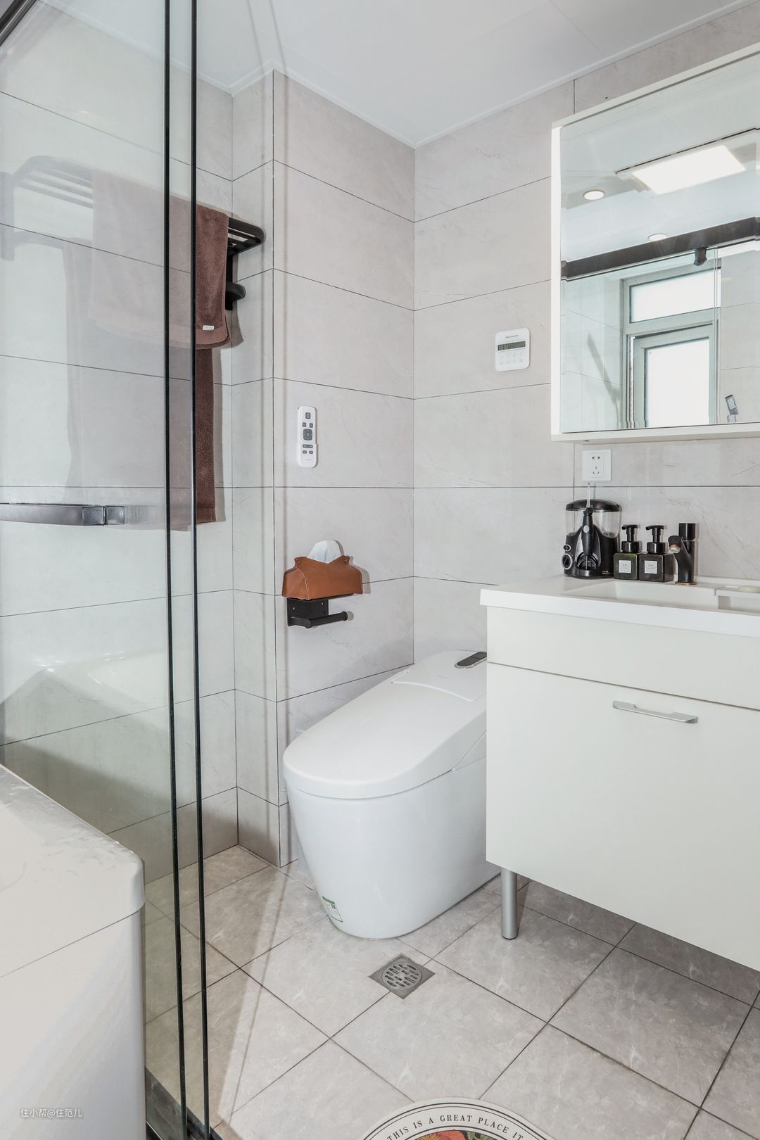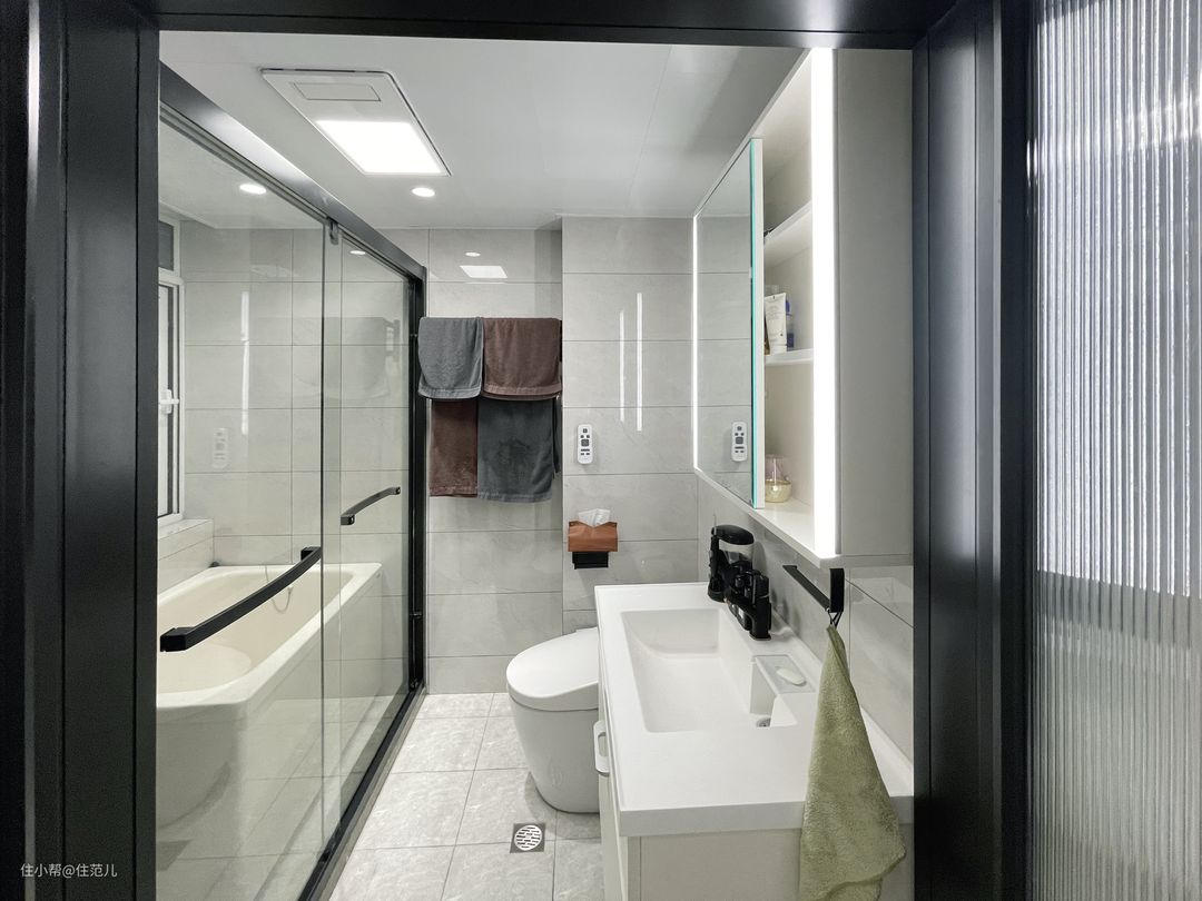 马桶和浴室柜也都是住范儿套餐内的产品,浴室柜底部离地30cm,方便清洁和收纳; 这也是我们一直在强调的,要么全落地,要么方便够着打扫,不留任何卫生死角。
