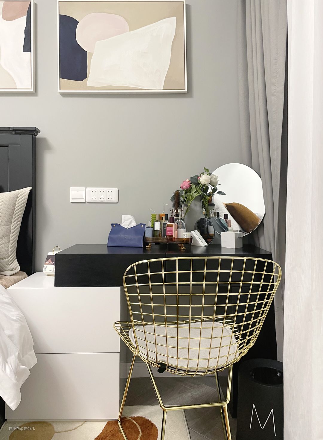 靠近飘窗的是深色的梳妆台,空间有限,买了可以调节宽度和长度的一款,抽屉容量很足够,日常使用的护肤品放在最上面都绰绰有余。 床边也是小块地毯装饰,家里的整体色调是简洁的黑白灰,剩下的就全交给软装去做一些跳色搭配,点亮空间。