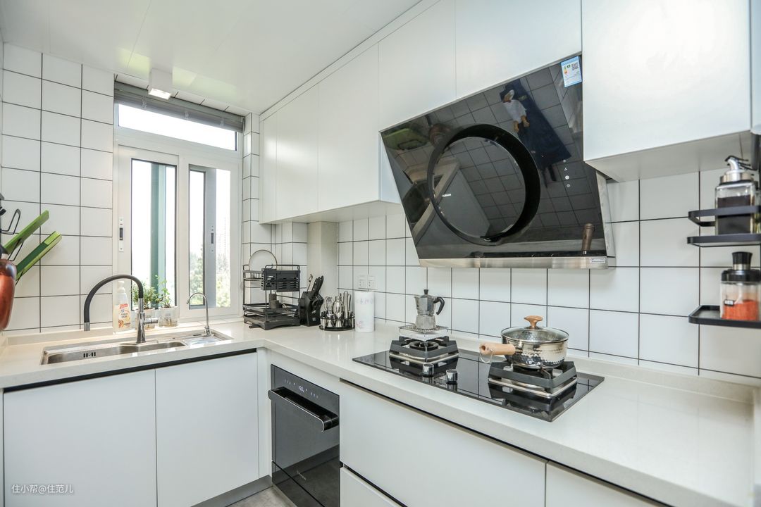 墙面铺贴小白砖,百搭的同时,防污能力也挺好; 老板的烟机灶具,灶台上放置着意式咖啡壶和雪平锅,角落的沥水架和调酒用的可旋转工具架,从细节处展现了Vicky对生活的细心。