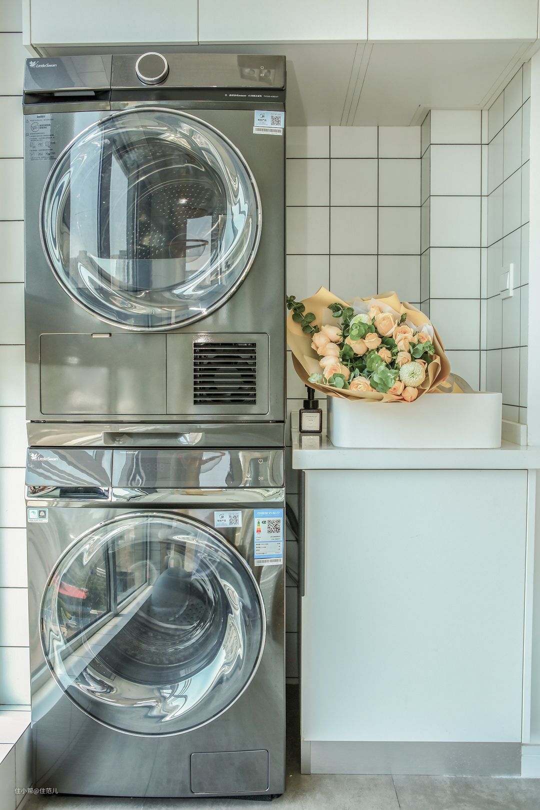 洗衣机和烘干机都是国产品牌小天鹅的产品,衣物洗烘完之后,可以直接收纳回衣柜; Vicky不想在阳台安装升降晾衣杆,一是觉得淘宝上大多数都不太好看,二是遇上梅雨天,与其晾晒,不如烘干效果更好,干得更快。