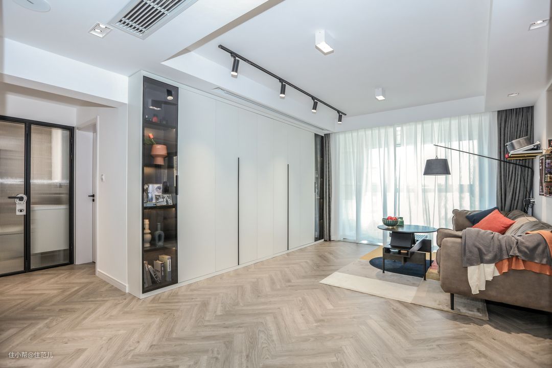 定制柜没有设计成全封闭式,两侧用黑色内壁+内嵌灯光+玻璃门板,藏八露二这种最经典的设计,完全不会有沉闷的感觉。 客厅是简洁的无主灯设计,轨道灯、射灯和落地灯搭配起来,家庭照明不受影响,氛围感十足。