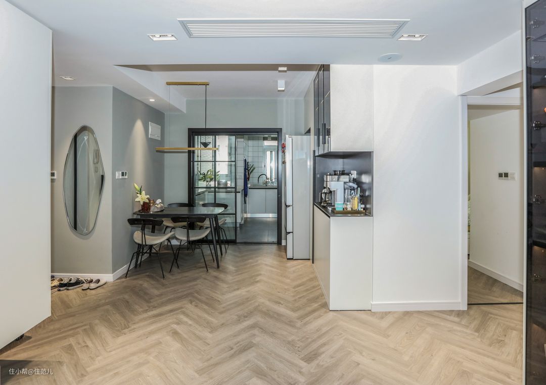 为了让餐厅更加舒适好用,设计师将过道的空间匀给了餐厅和次卧,次卧与餐厅的隔墙延伸了97公分,餐厅更加完整。 餐桌靠在短墙上,加长宽度之后的墙面,定制了通顶的储物柜用作茶水台,内嵌西门子的双开门冰箱,方便Vicky坐在餐厅泡泡咖啡和茶。 ▼改造后