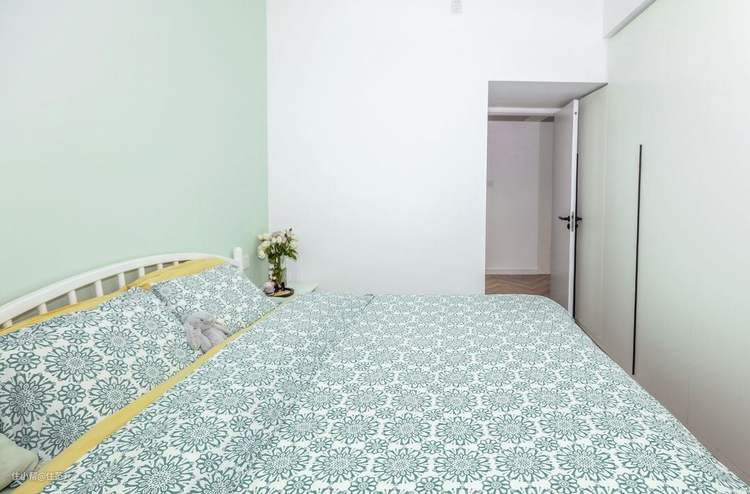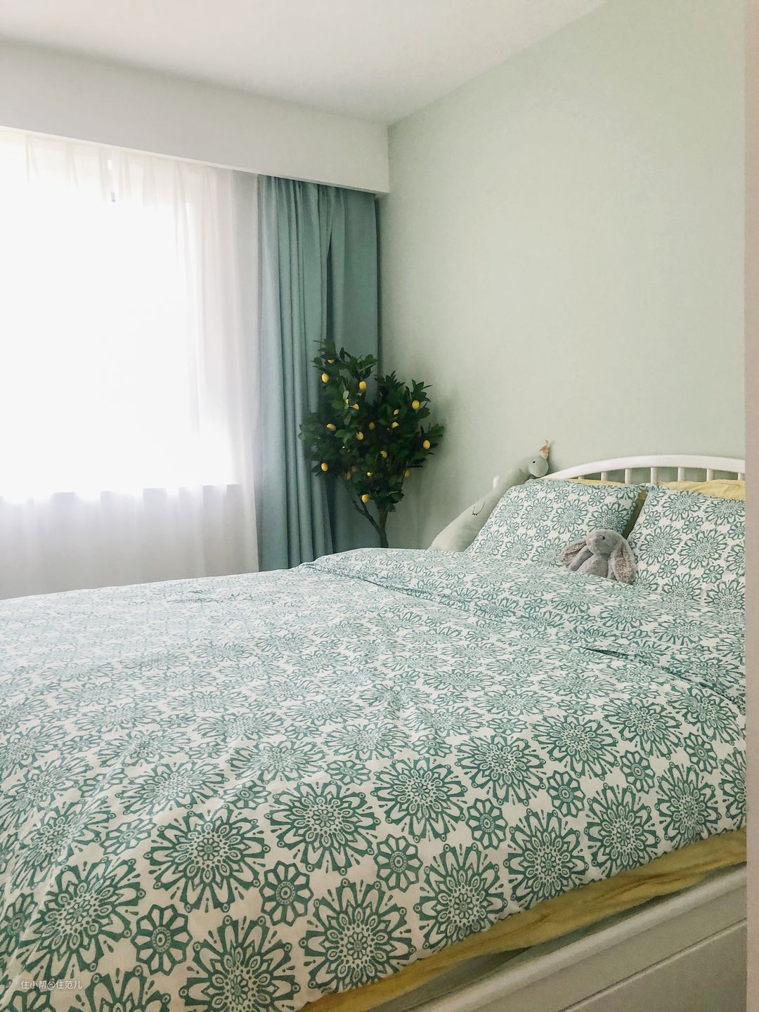 次卧打算之后用作儿童房,墙面刷了比较清新的薄荷绿色,配套的绿色花纹床品是在宜家买到的,现在大多时候还是用做客房,或者小两口加班太晚了,就一人一个卧室休息。 次卧没有主卧面积大,同样放下1.8m的床,就稍微显得有点大。