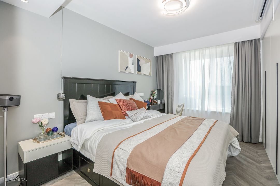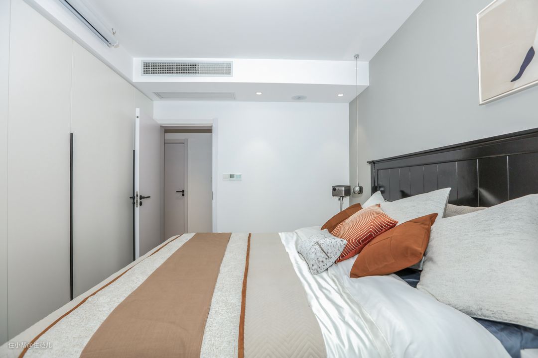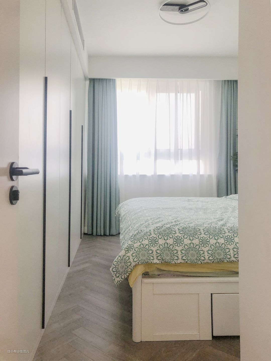 主卧部分床头墙刷上了浅灰色,设计师主要在衣柜的布局上花了些小心思。 之前主卧的门洞靠墙,衣柜只能布置在短墙上;通过改变门的位置,门背后设计了整墙的衣柜,储物量更大,空间利用率更高。 衣柜不在床的侧边,1.8m的床两边空间很宽裕,方便日后放婴儿床和梳妆台。
