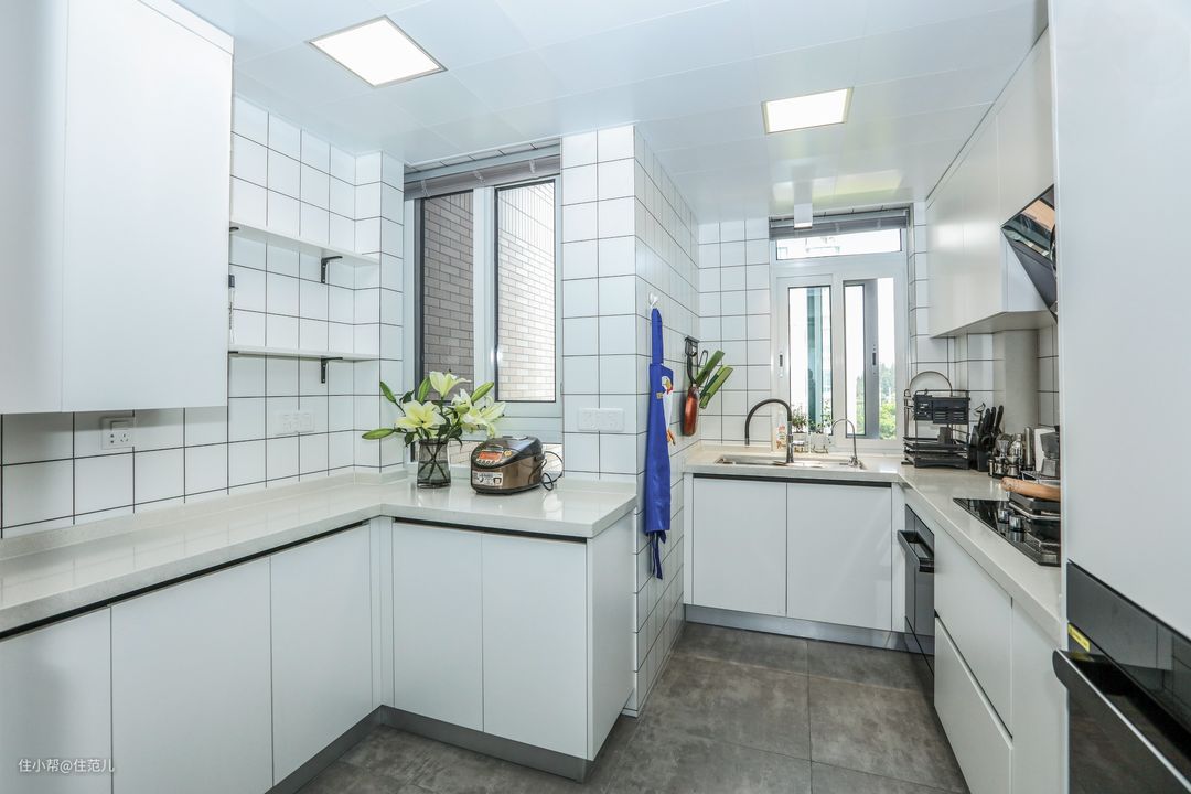整个厨房空间呈现为L型布局,转角刚好把台面划分为西厨和中厨两个区域,台面空间很足够,即使两人都在厨房,切菜备餐也不会觉得周转不开。