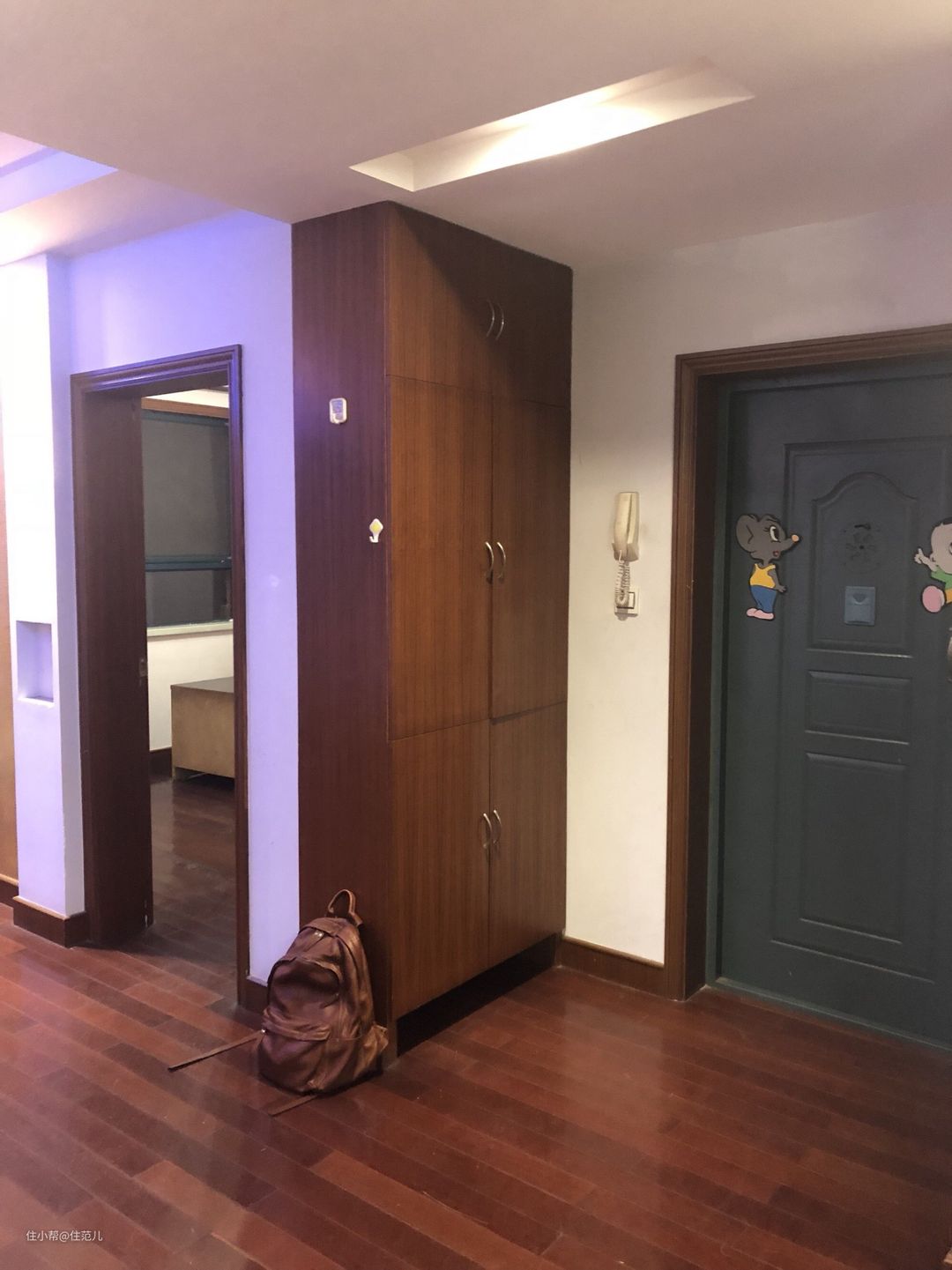 改造之前的玄关,一进门就是猪肝色的地板和深色定制柜,搭配铁青色的防盗门,说实话真的有点辣眼睛。 ▼改造前