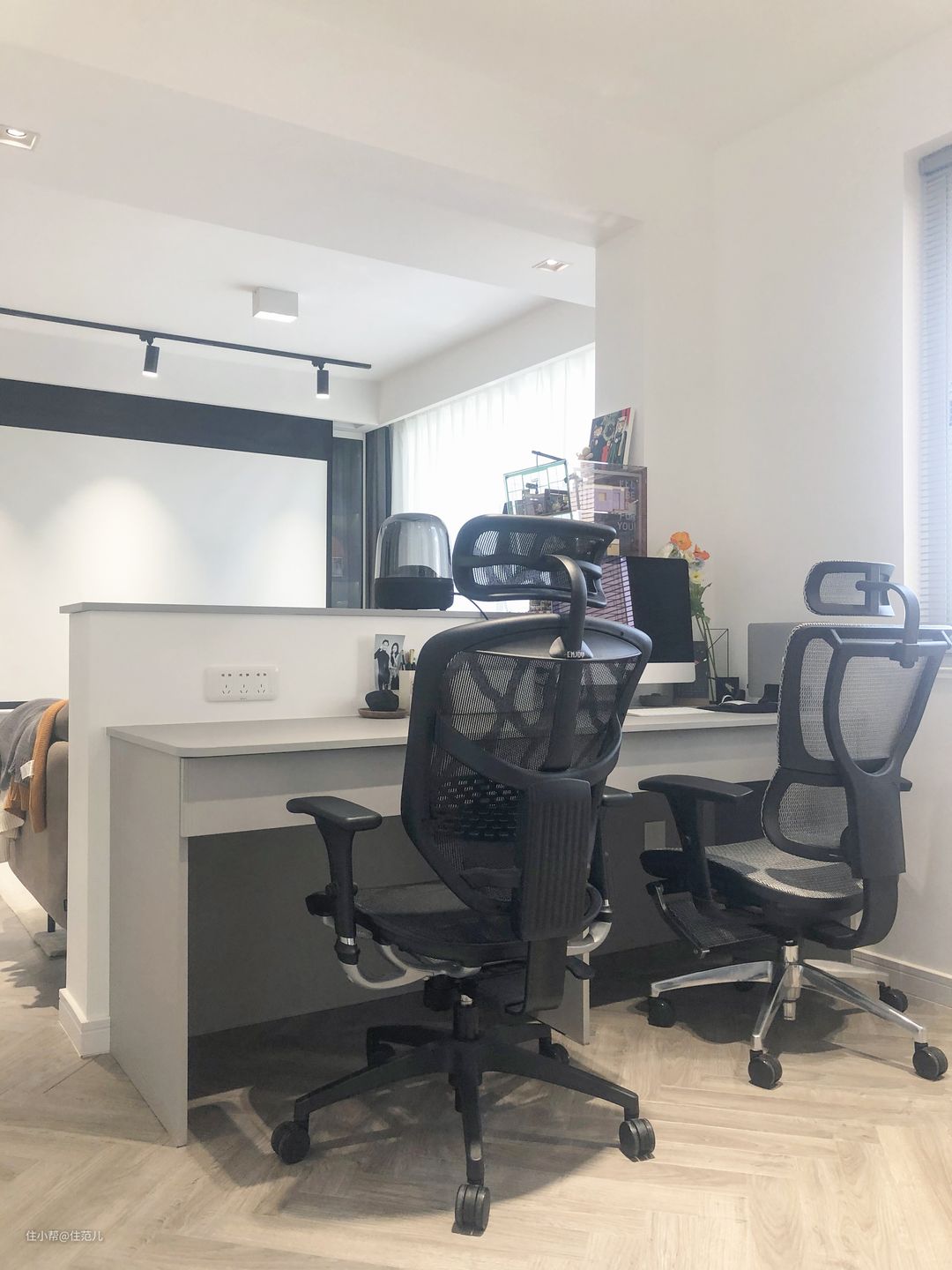 办公桌和家里的储物柜一同设计定制的,颜色选择浅灰色,符合整体家居色调; 办公桌正朝向客厅的投影位置,有时候工作可以直接把电脑屏幕投在客厅投影上讨论,很方便。 经常加班到晚上一两点,所以办公的舒适度很重要,办公椅的预算更高一些,入手的是保友金卓的人体工学椅;