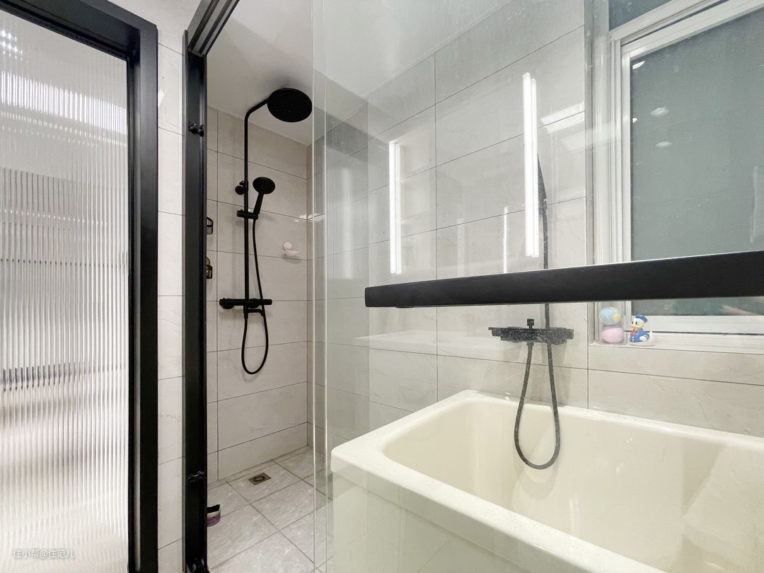 淋浴区使用的是住范儿的黑色花洒和黑色置物架,不用担心水渍残留。