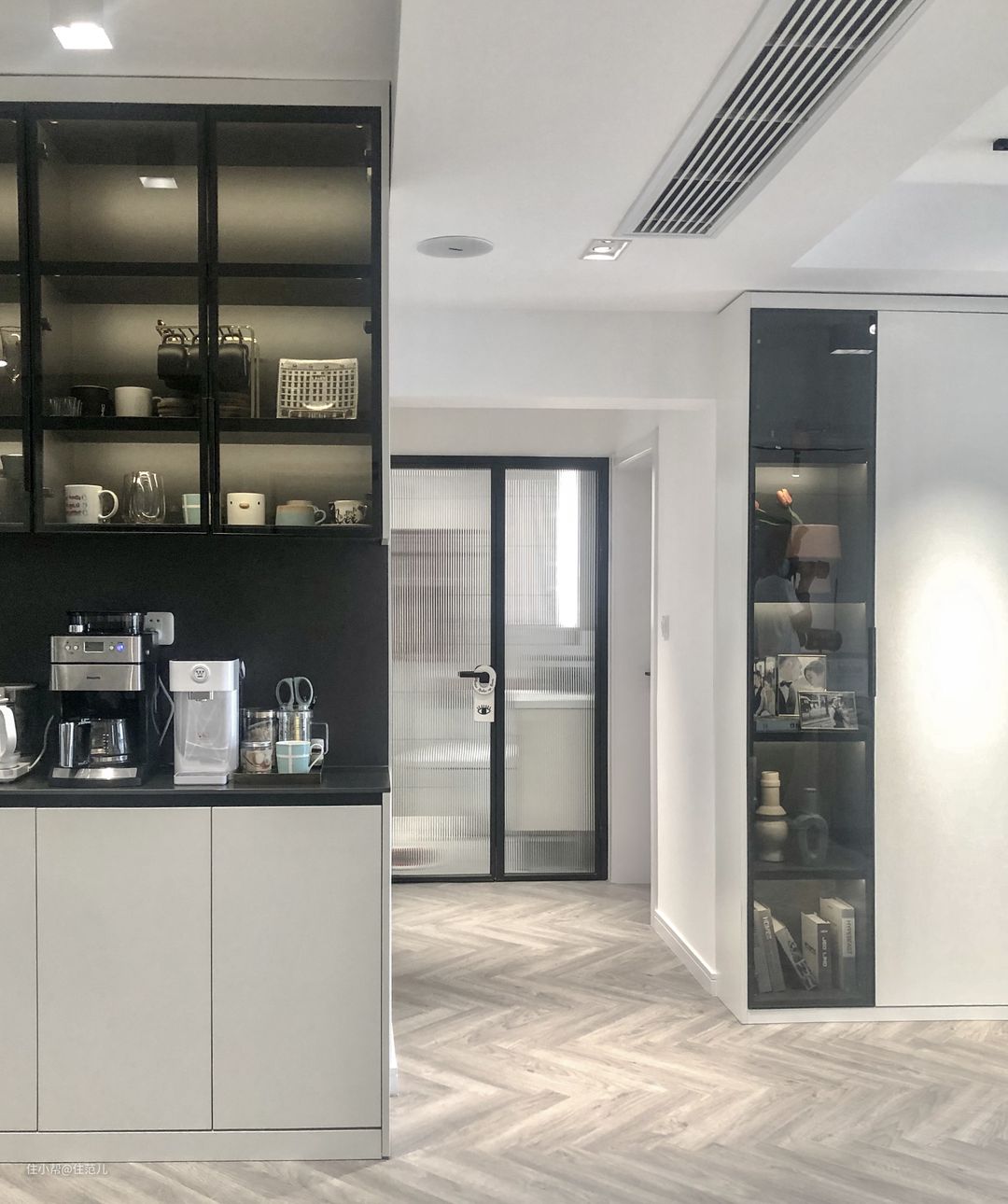 为了防止猫往厨房乱跑,厨房还是得做成封闭式,拆掉酒柜之后,设计师直接换成了铝镁合金双移门,整个空间的不通透和采光差都很好的改善。 ▼改造后