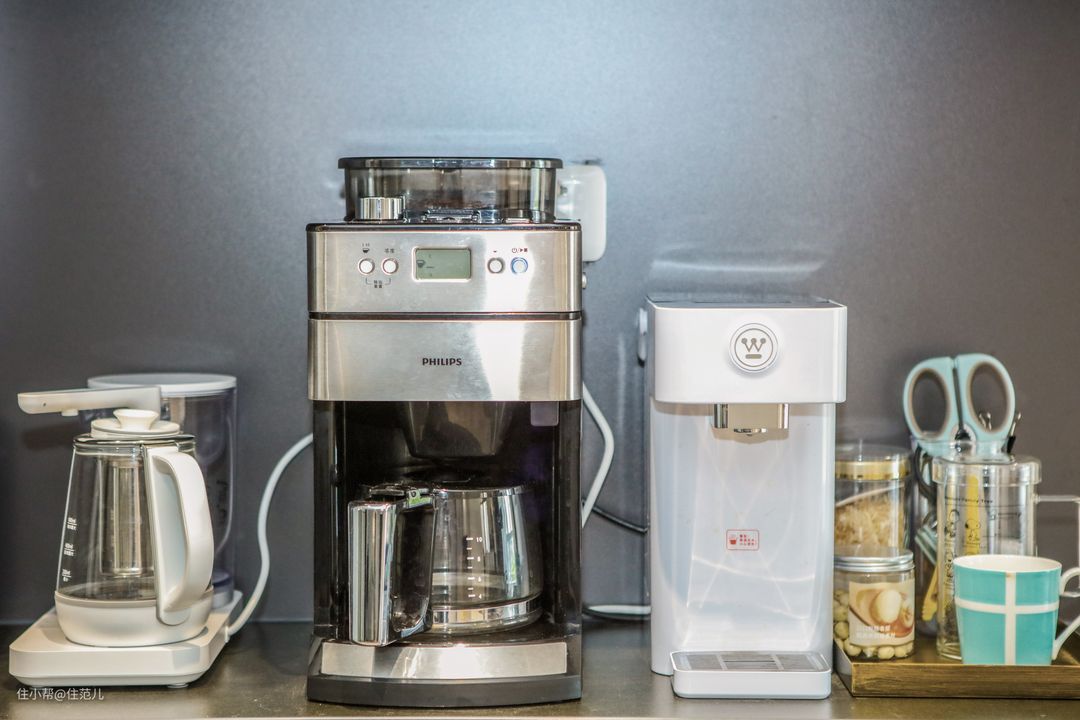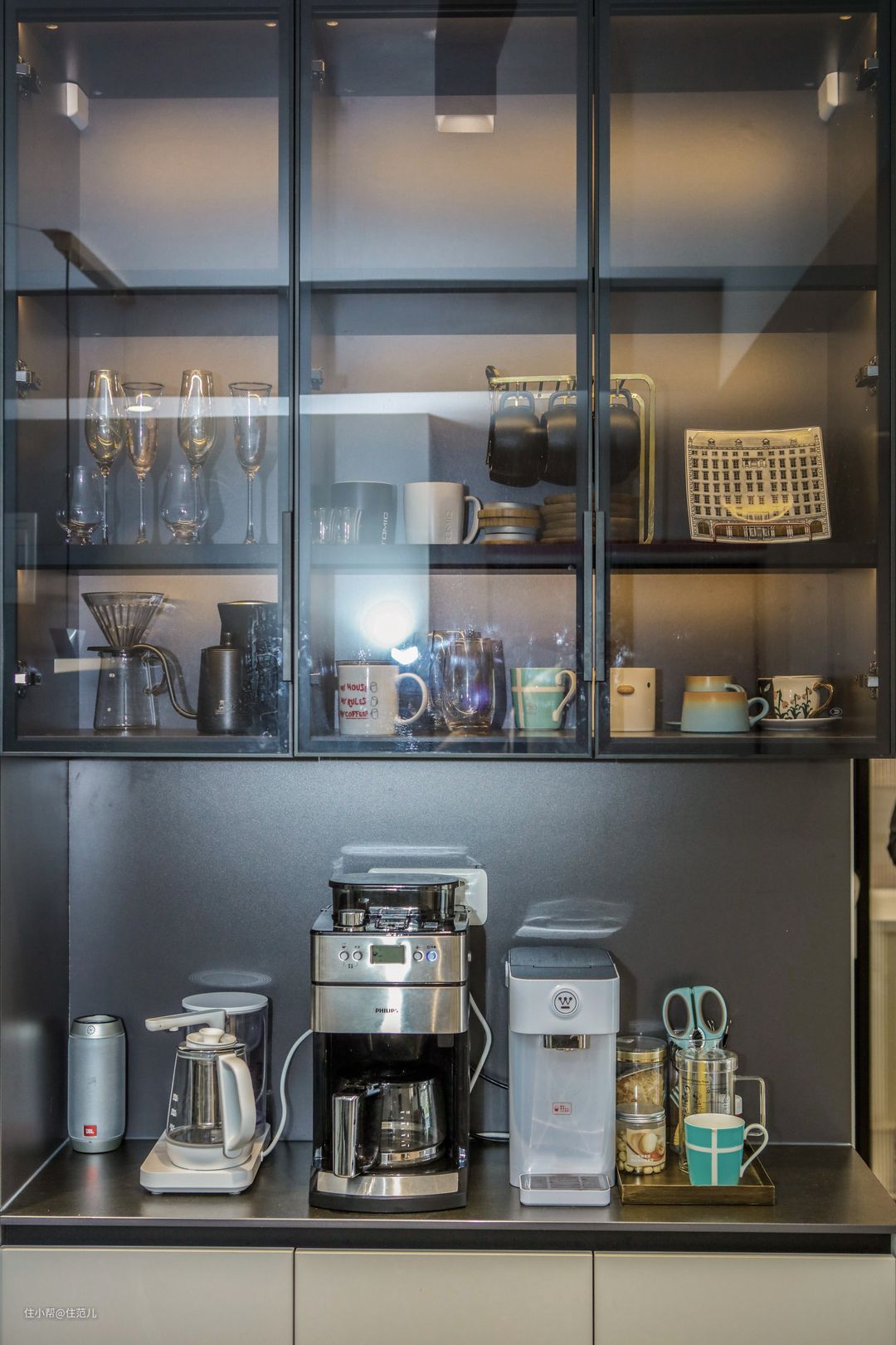 新加的茶水台是Vicky家里最喜欢的角落之一,周末在这冲好咖啡泡好茶,然后在客厅看电影,或者看看书,都很方便。 上方透明柜门+内嵌暖光灯带,一目了然就能找到自己想用的杯具;中间的台面依次放置着煮茶器、飞利浦的美式咖啡壶和西屋的饮水机。 咖啡和茶叶就收纳在下方的柜体中。