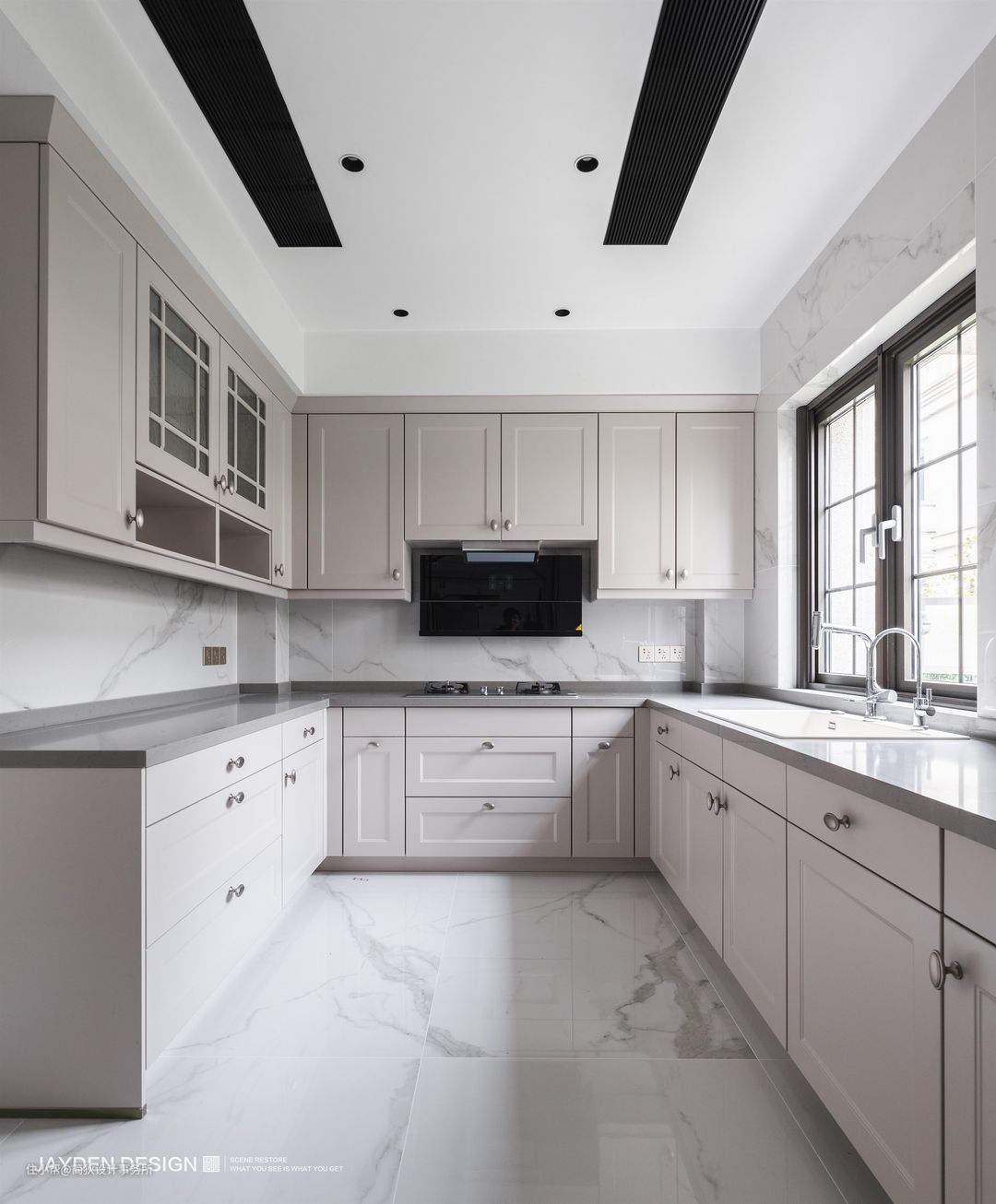 厨房分为中厨和西厨两部分,全部选用德国柏丽的橱柜。大象灰的台面搭配灰紫色橱柜,高雅而不失浪漫格调。
