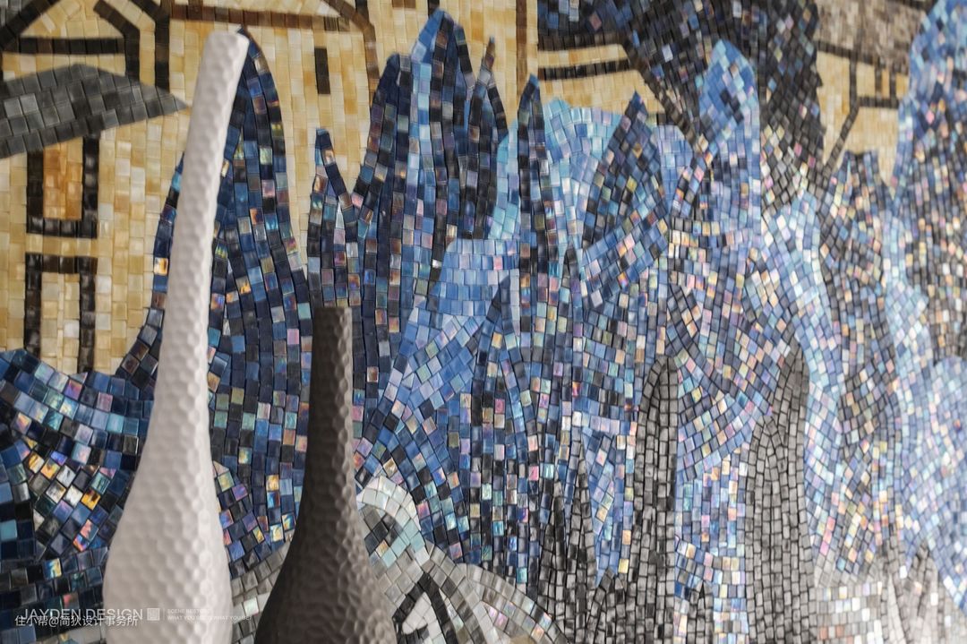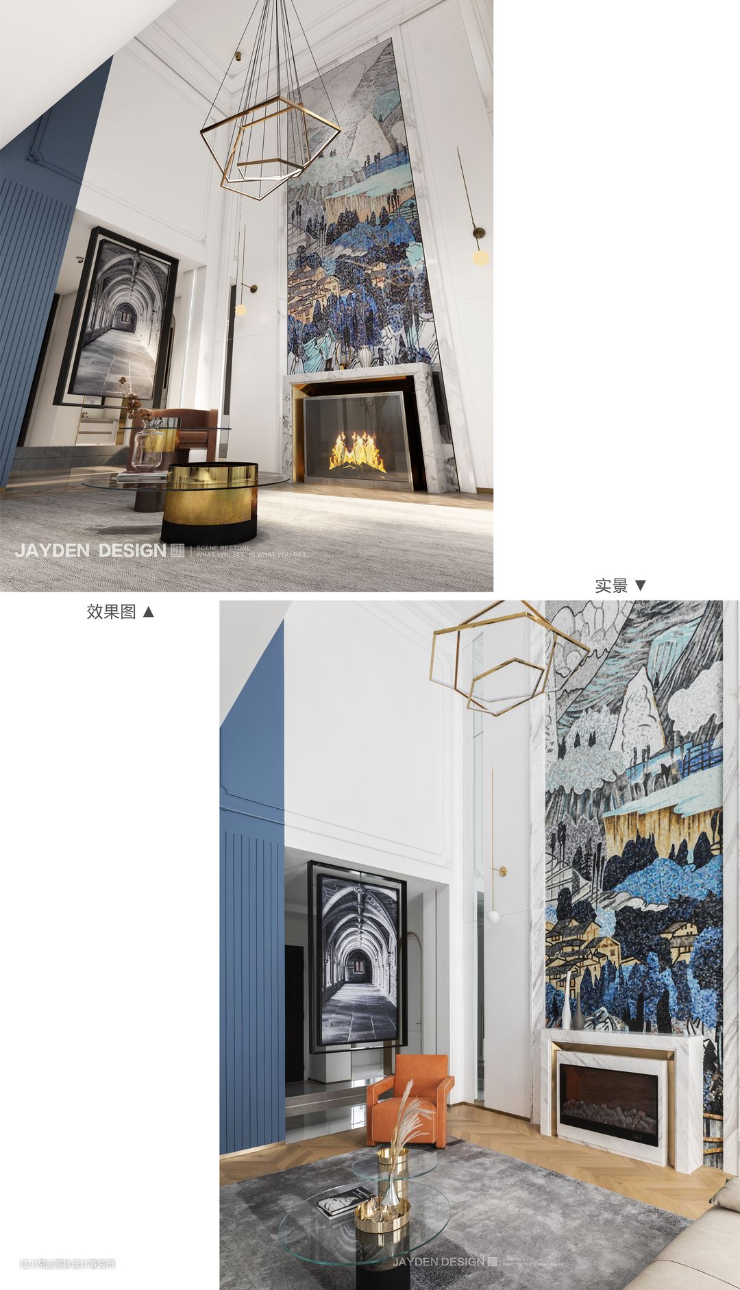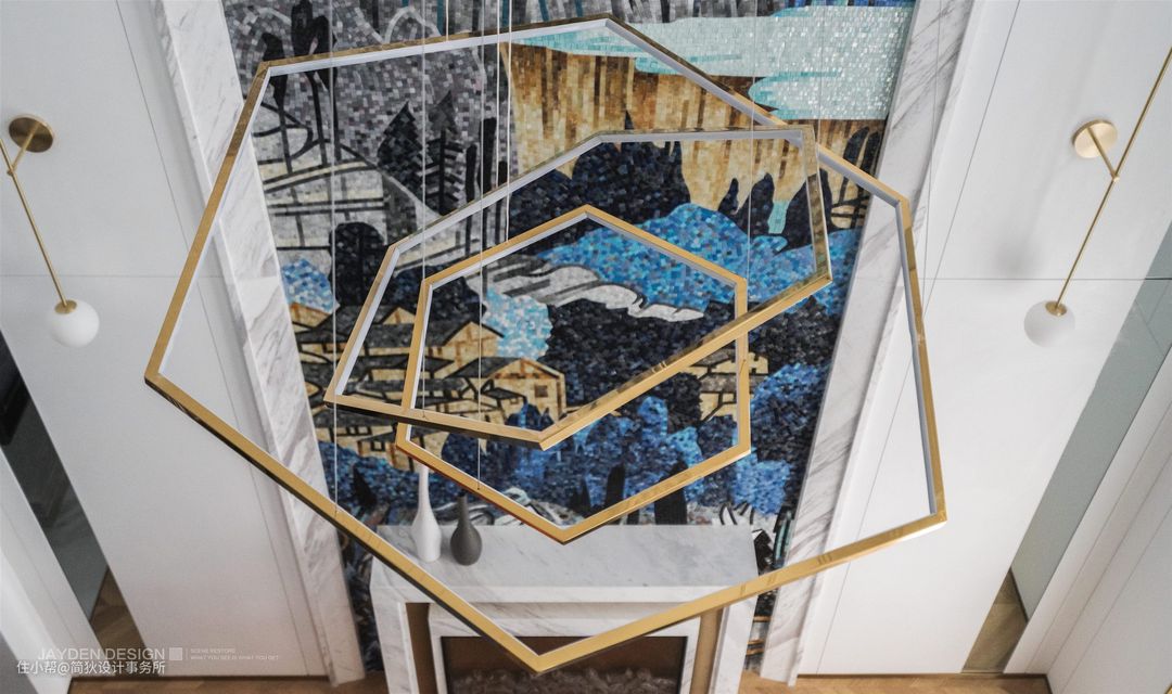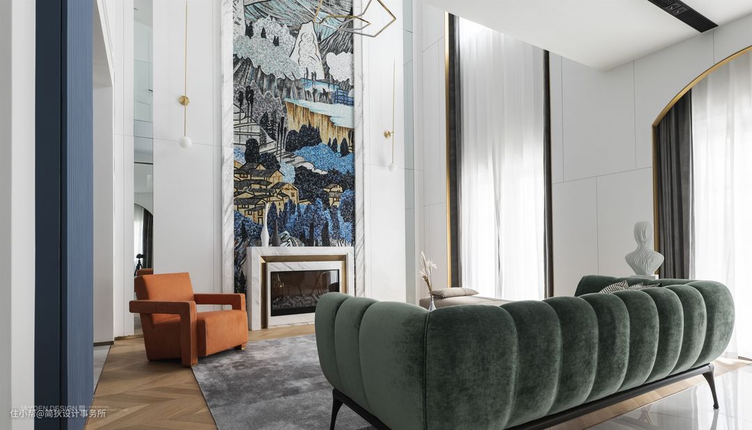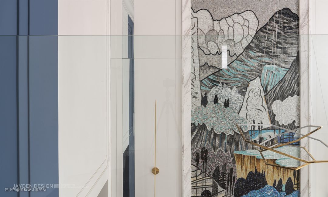 高达6.5米的挑空客厅气势恢宏,挑空部分侧面做了分色设计,让蓝色贯穿两层空间,更具延展性。纯白的基调下局部点缀华丽的色彩,充满Artdeco的摩登感。一面带有中国风的巨幅马赛克山水画璀璨夺目,让空间独具一格。白色大理石壁炉看似简单的造型,实则有多个转折面与一公分的转折收口,加之天然石材与金属结合的工艺十分考究,设计感十足,彰显出业主的高雅格调。