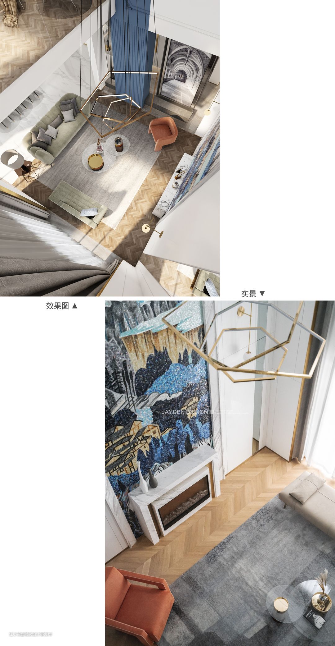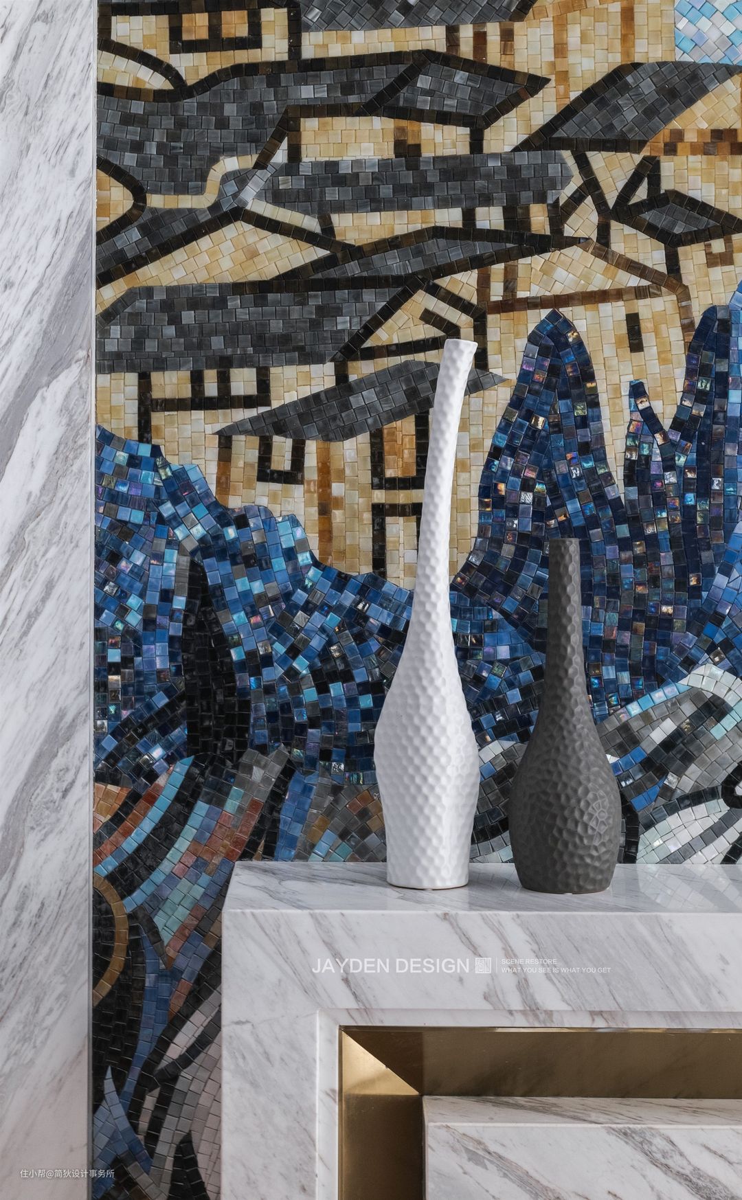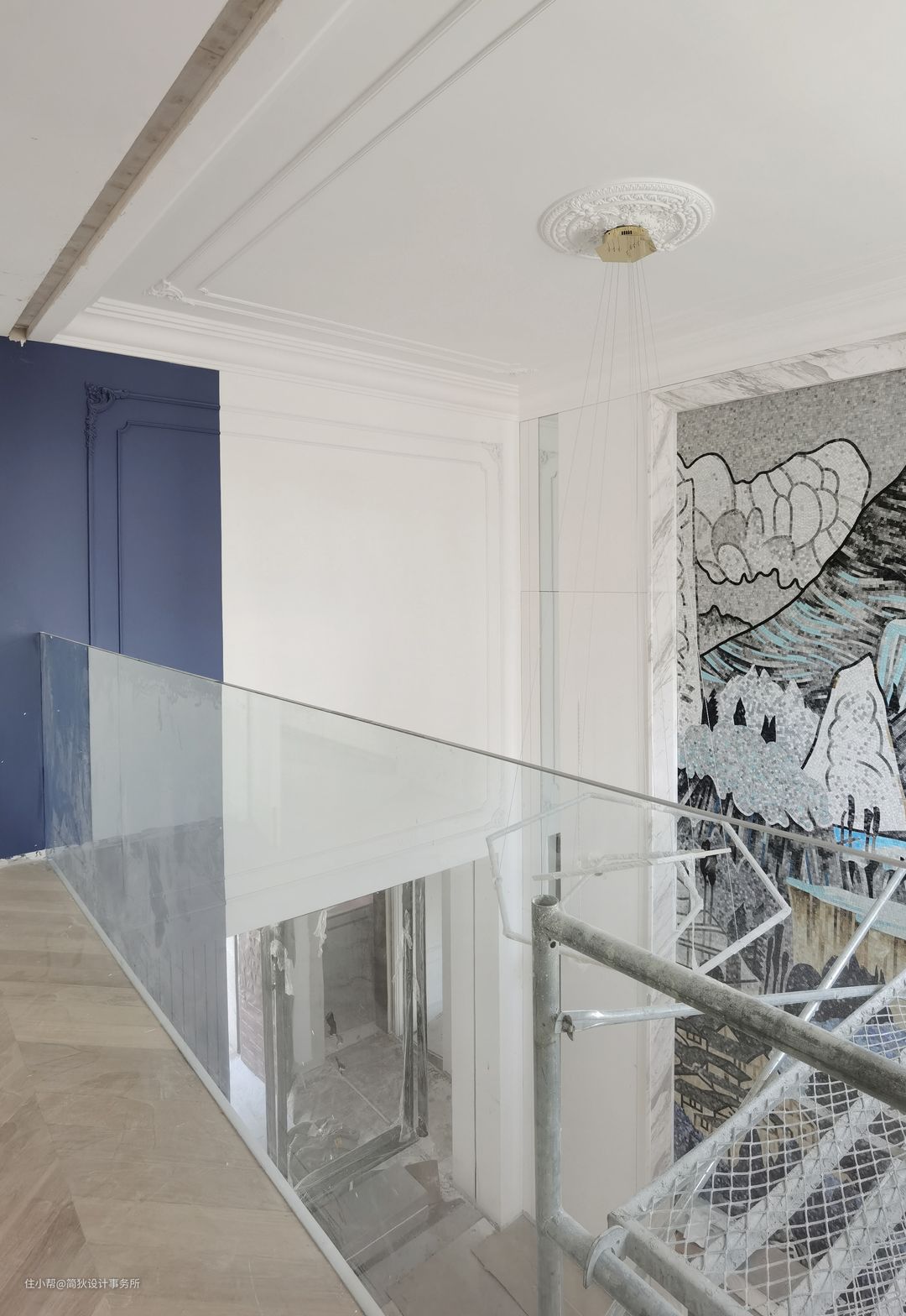 高达6.5米的挑空客厅气势恢宏,挑空部分侧面做了分色设计,让蓝色贯穿两层空间,更具延展性。纯白的基调下局部点缀华丽的色彩,充满Artdeco的摩登感。一面带有中国风的巨幅马赛克山水画璀璨夺目,让空间独具一格。白色大理石壁炉看似简单的造型,实则有多个转折面与一公分的转折收口,加之天然石材与金属结合的工艺十分考究,设计感十足,彰显出业主的高雅格调。