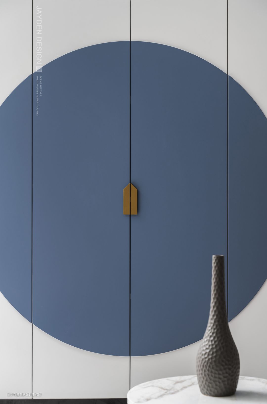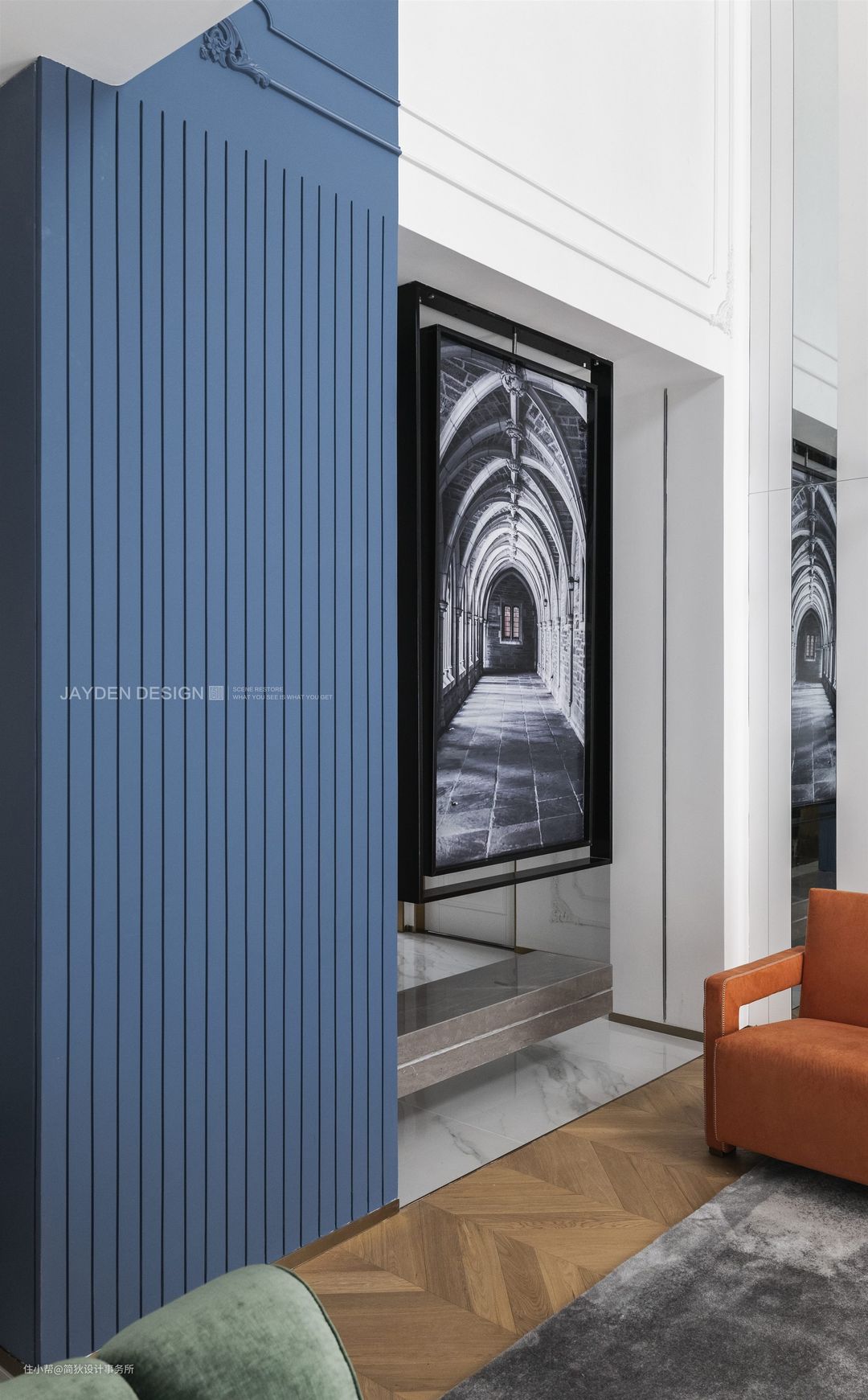 由于门厅柜体大部分为原有结构柱,设计师利用柱体设计成玄关的一部分,兼具了储物功能。局部用维多利亚蓝来贯穿全屋,并延续到地下室空间。