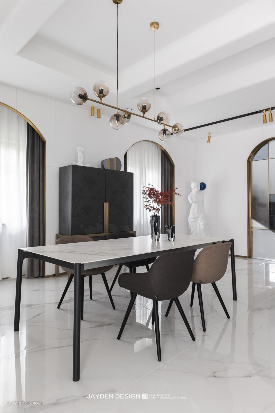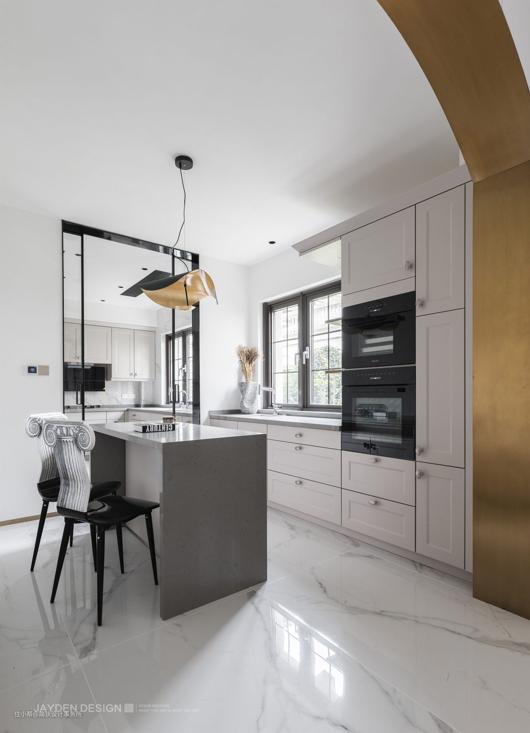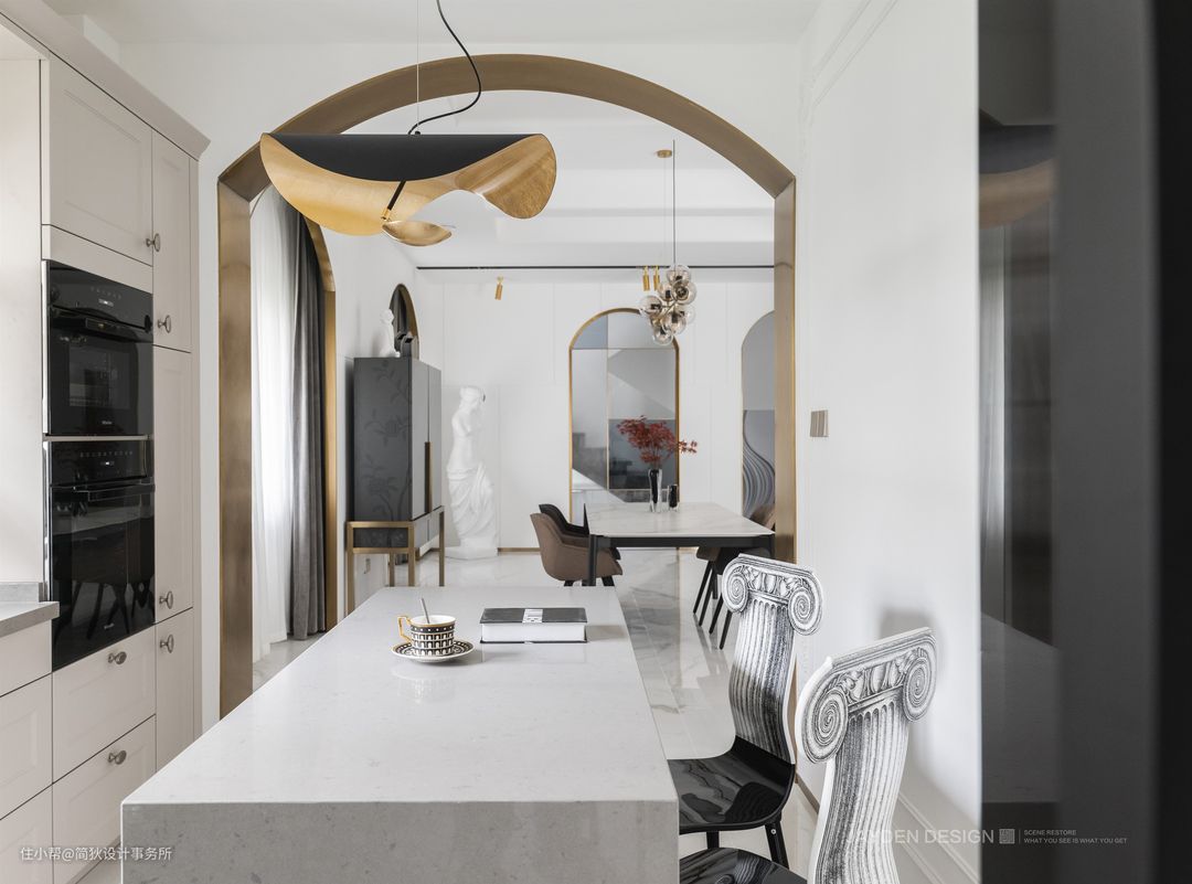 宽敞明亮的餐厅被拱形门洞所围合,金色的不锈钢门套让整个餐厅熠熠生辉,多了几份奢华与高贵。