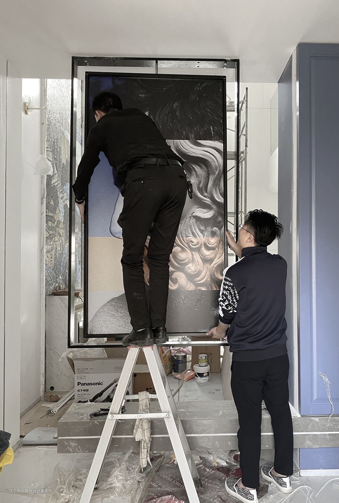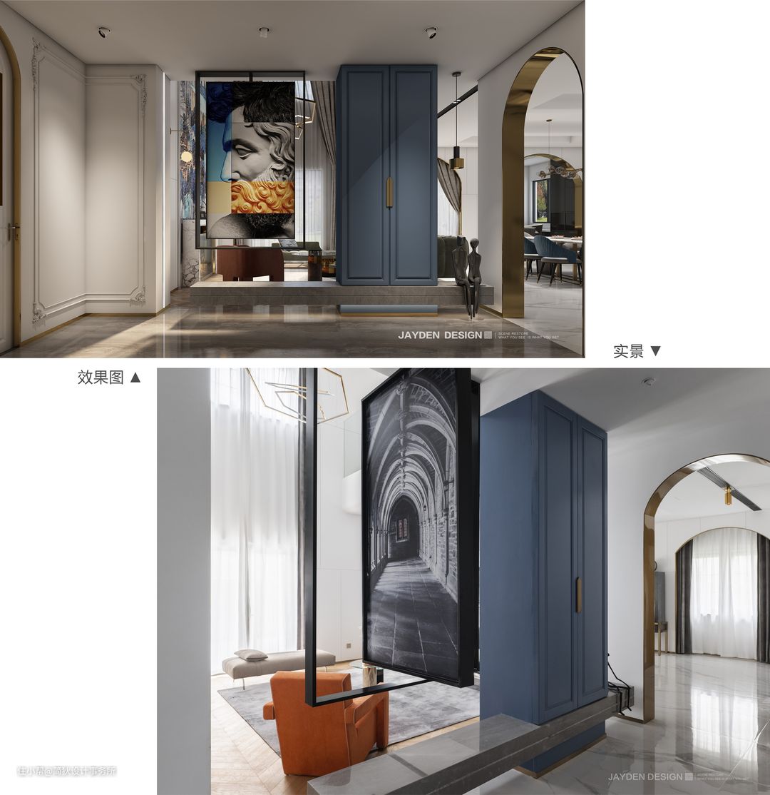 为了使得空间更具纵深感,门厅处理上也选择半遮挡的设计。悬挂的艺术画可以360度旋转,业主可以根据心情喜好更换艺术画,为门厅营造不同的感觉。