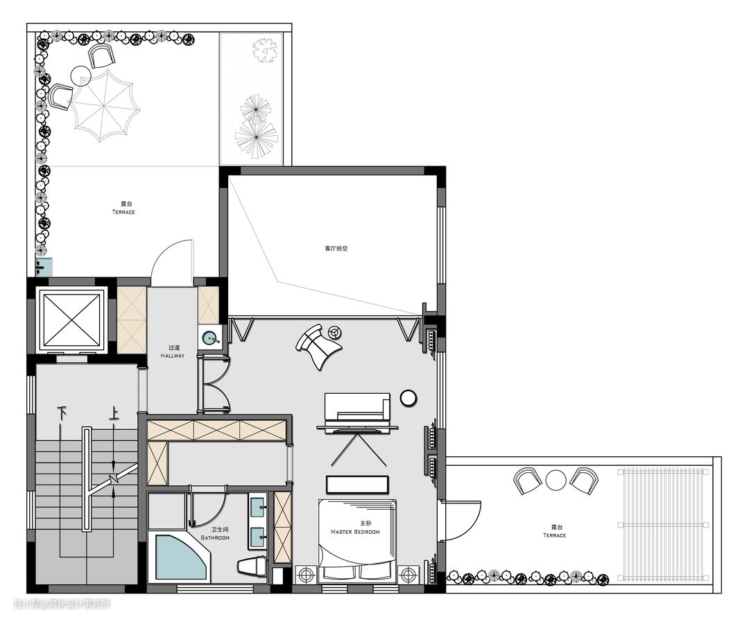 平面布置图|Floor plan|F2 我们将二层主卧空间划分为半开放的起居室和卧室两部分,两个空间自由开启与关闭,同时起居室又直接位于挑空的一层客厅之上,与客厅可随时互动;卧室直接连接露台。玻璃栏杆内巧妙地安装了对开的艺术玻璃折叠门,更显精致奢华。
