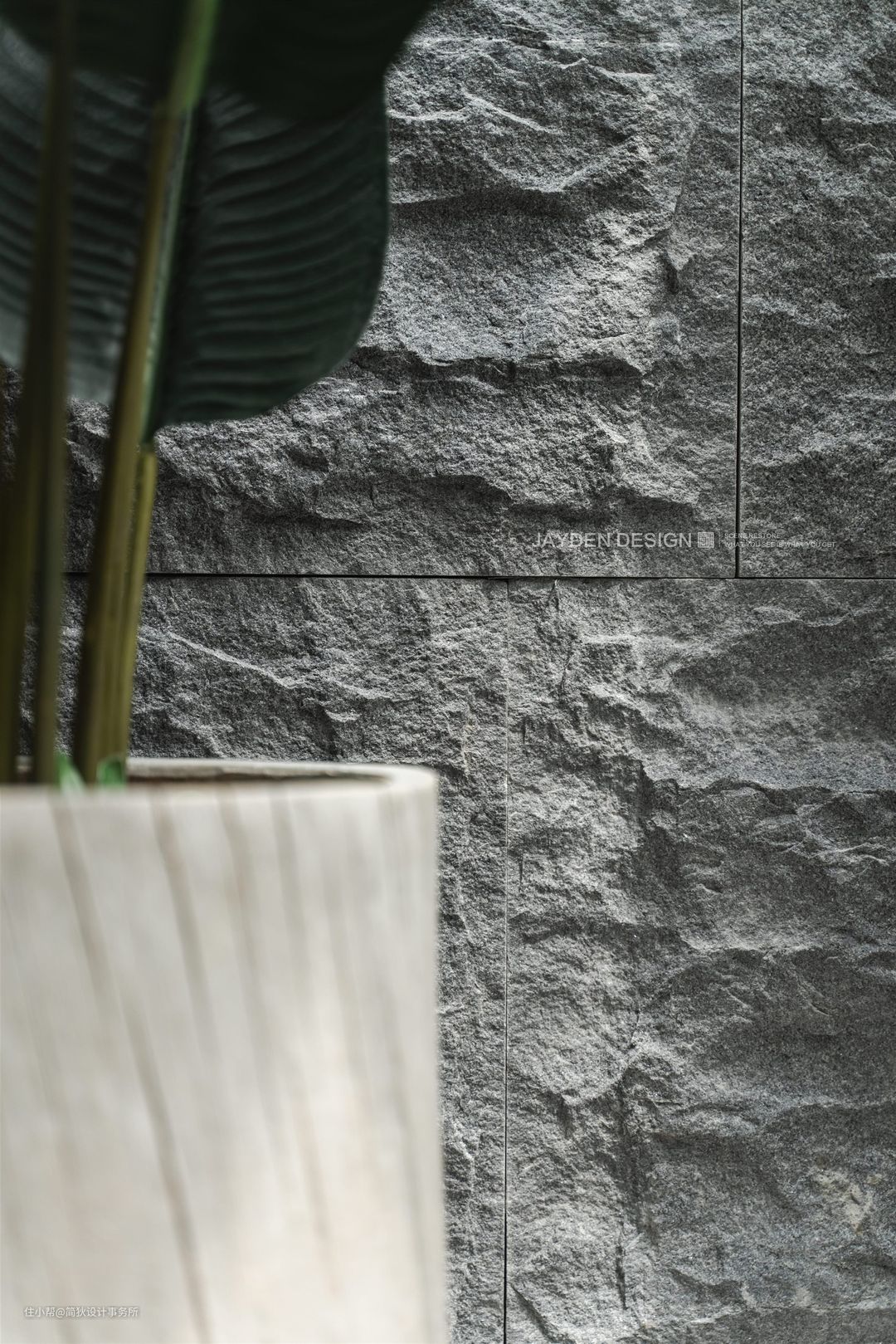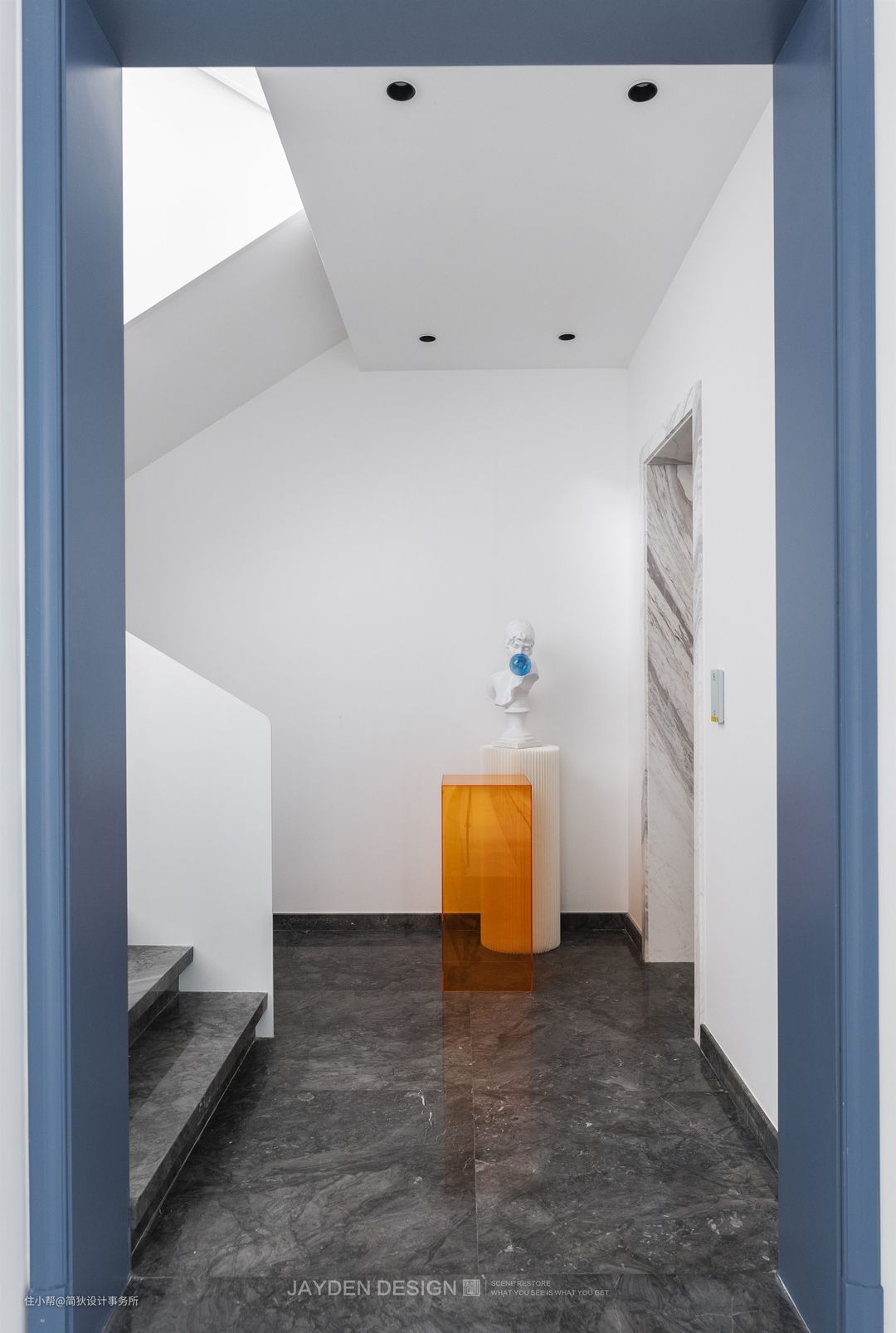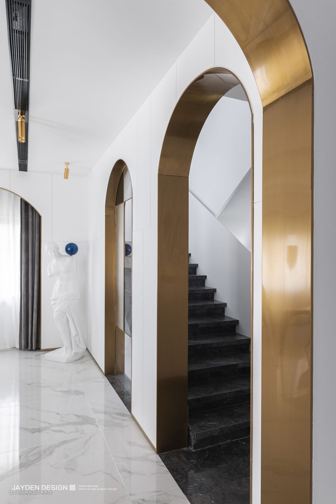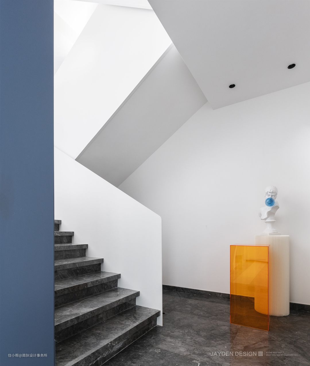 设计上我们力求简洁利落,材质上选用和墙面统一的纯白烤漆钢板扶手搭配黑灰色大理石,强调了黑白对比的设计效果。