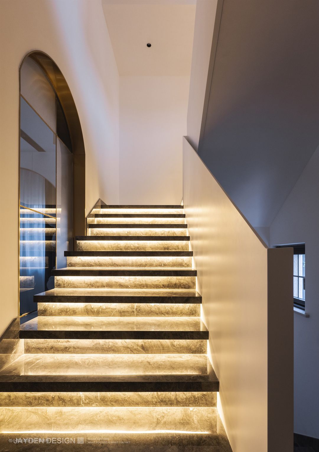 每层阶梯下都安装有感应灯带,暖黄的灯光炽烈地跃动着,烘托出楼梯的质感。