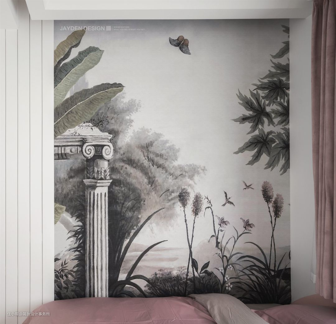 背景墙选用一幅复古梦幻壁纸,打造出与众不同的浪漫复古氛围。