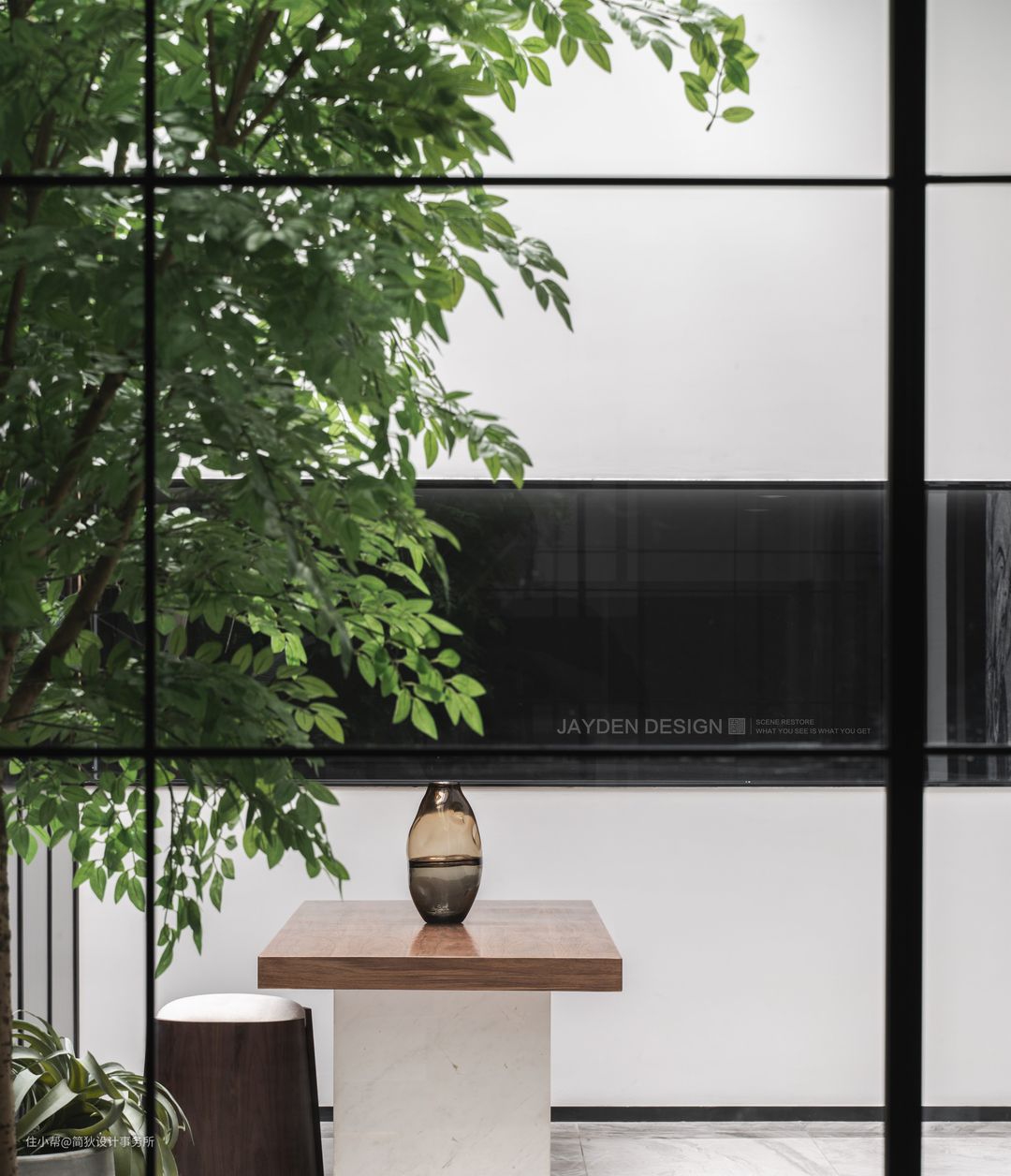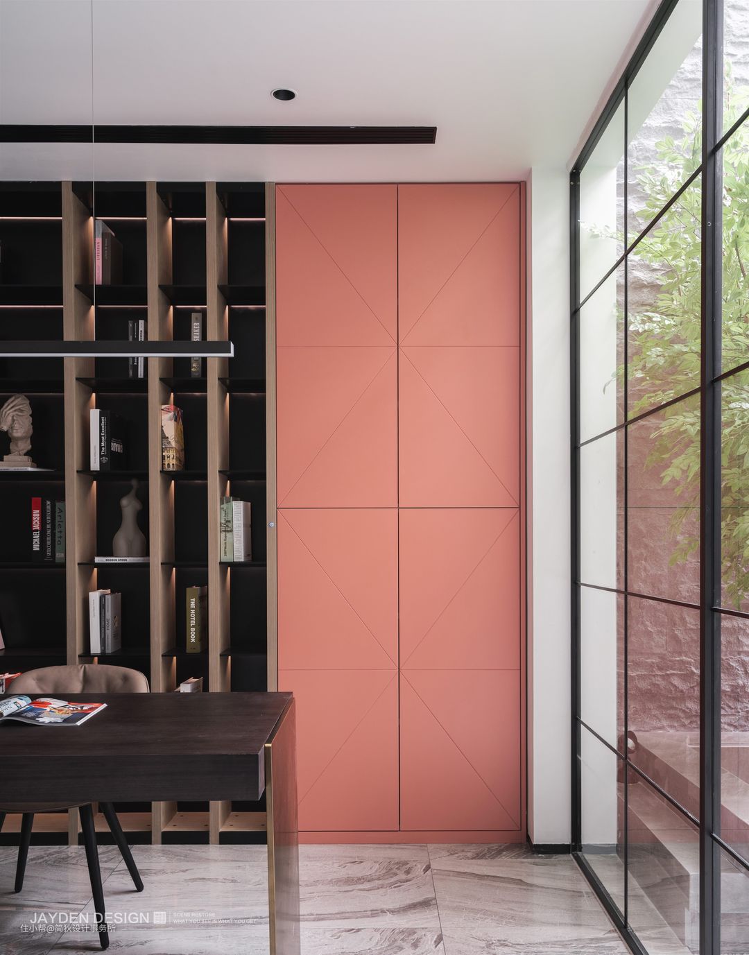 天井被设计成下沉式庭院。一株幸福树尽情伸展绿意,阳光透过书房的落地窗洒进来,带来温暖惬意的自然气息。