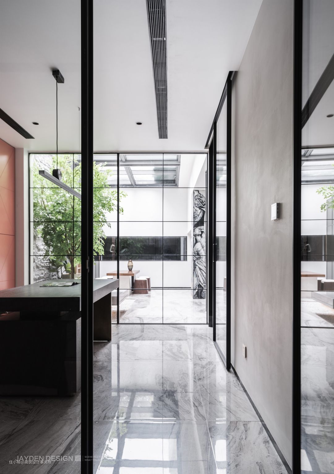 带有流水纹路的浅灰色地砖充满现代格调,蓝与白的经典搭配令人耳目一新。经典的 Gallotti Radice 弧形沙发,营造出舒适而围合的会客氛围。品茶区位于半露天的天井内,毗邻宽敞的会客厅,中间有玻璃移门分隔,减少能耗损失。