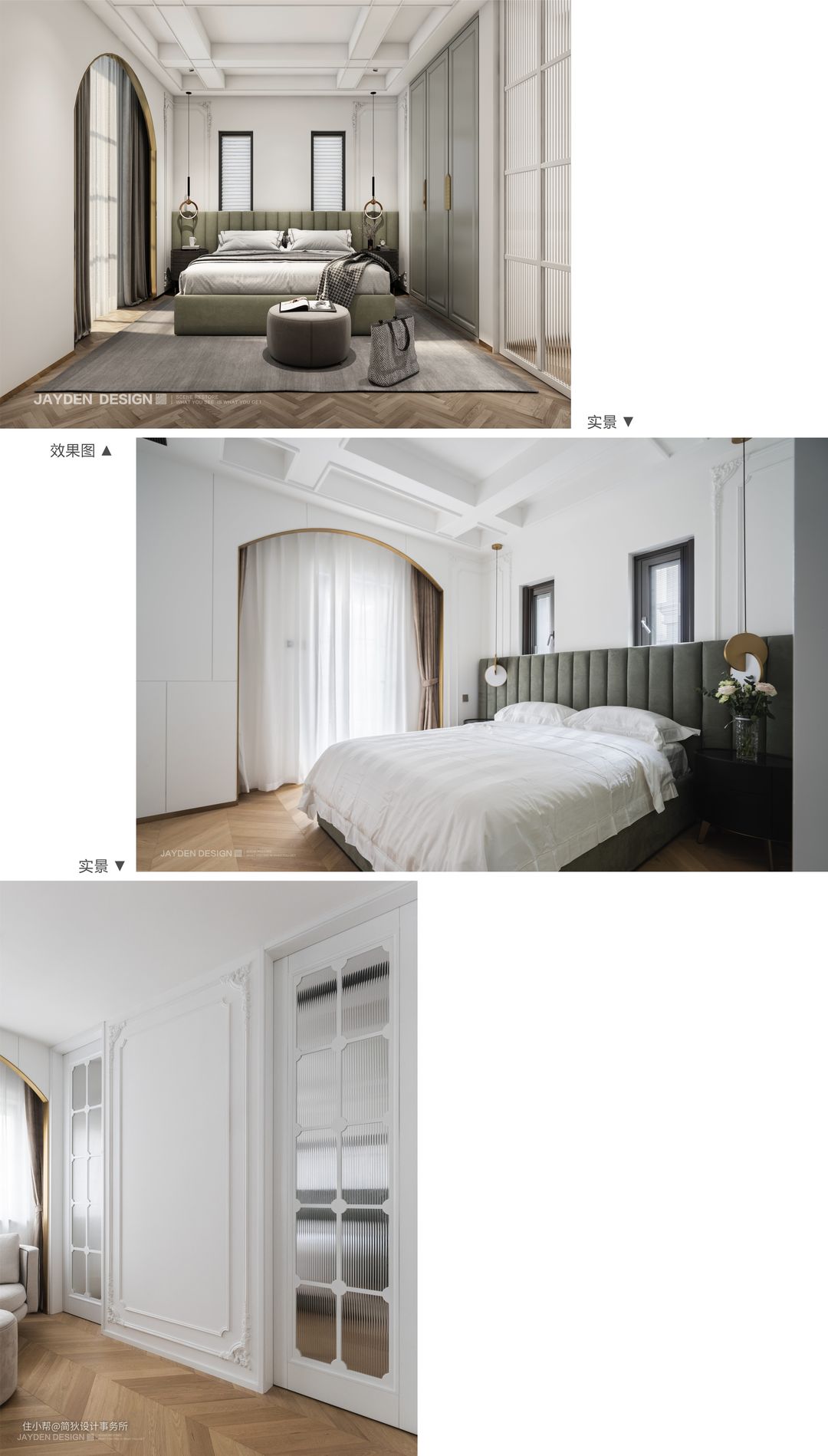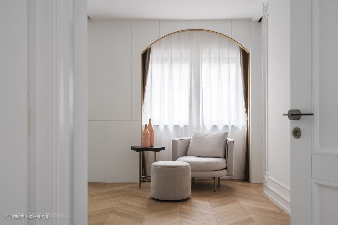 本案原始建筑存在窗户太小的硬伤,与室内设计非常不匹配。为了达到风格上的整体性和完美度,在不破坏外立面的情况下,我们选择拱形门套窗套的处理手法,视觉上放大了窗户比例,形成了完整统一的格调。