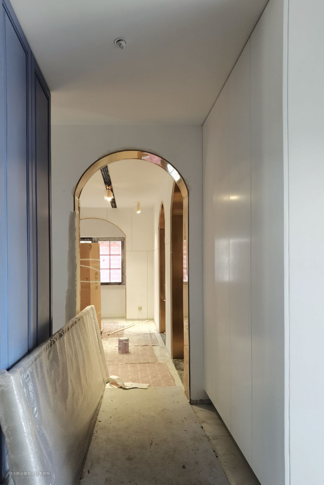 窗户一侧的墙面往室内另加了一层,以安装超高的拱形金属窗套,这样的设计是为了将两层的小窗“变”为整面的拱形落地窗,而且窗帘被完美的收至夹层中,不仅免去了安装窗帘盒,造型上也极为简洁更富层次感。