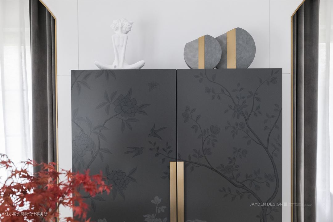 一款花鸟暗纹的仿古餐边柜,搭配金色拉手和充满设计感的摆件,浓郁的意式格调扑面而来。