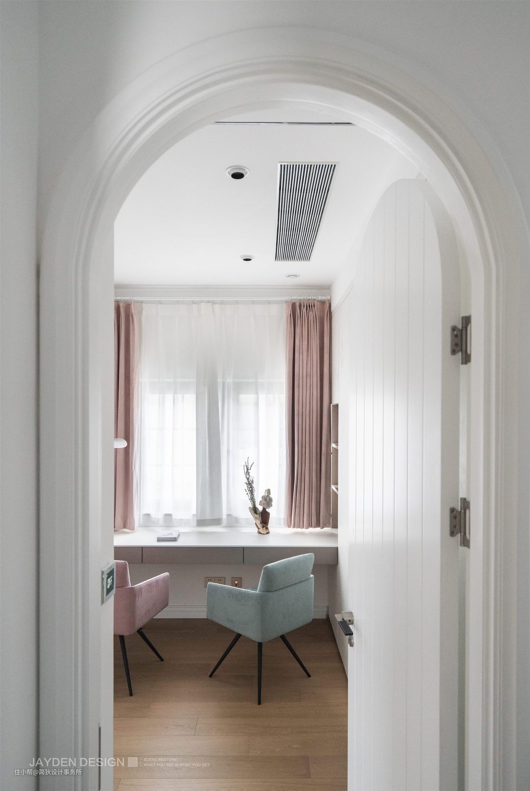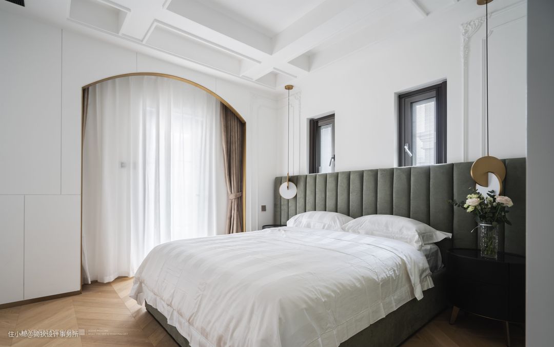 卧室依然选用统一的拱门造型,除了与整体空间相呼应外,木质的拱形纯白门套让人联想起童话世界里的公主房,充满温馨又浪漫的复古气息。另外和墙面同色,也更具整体感。