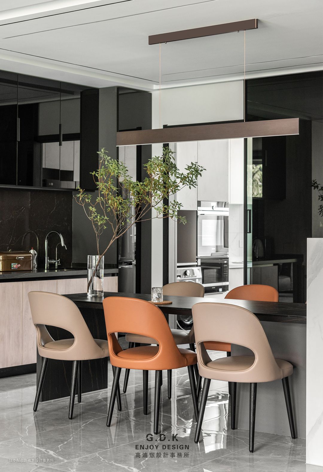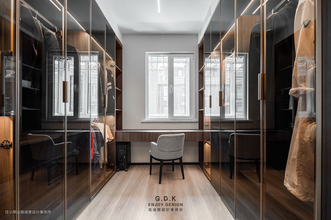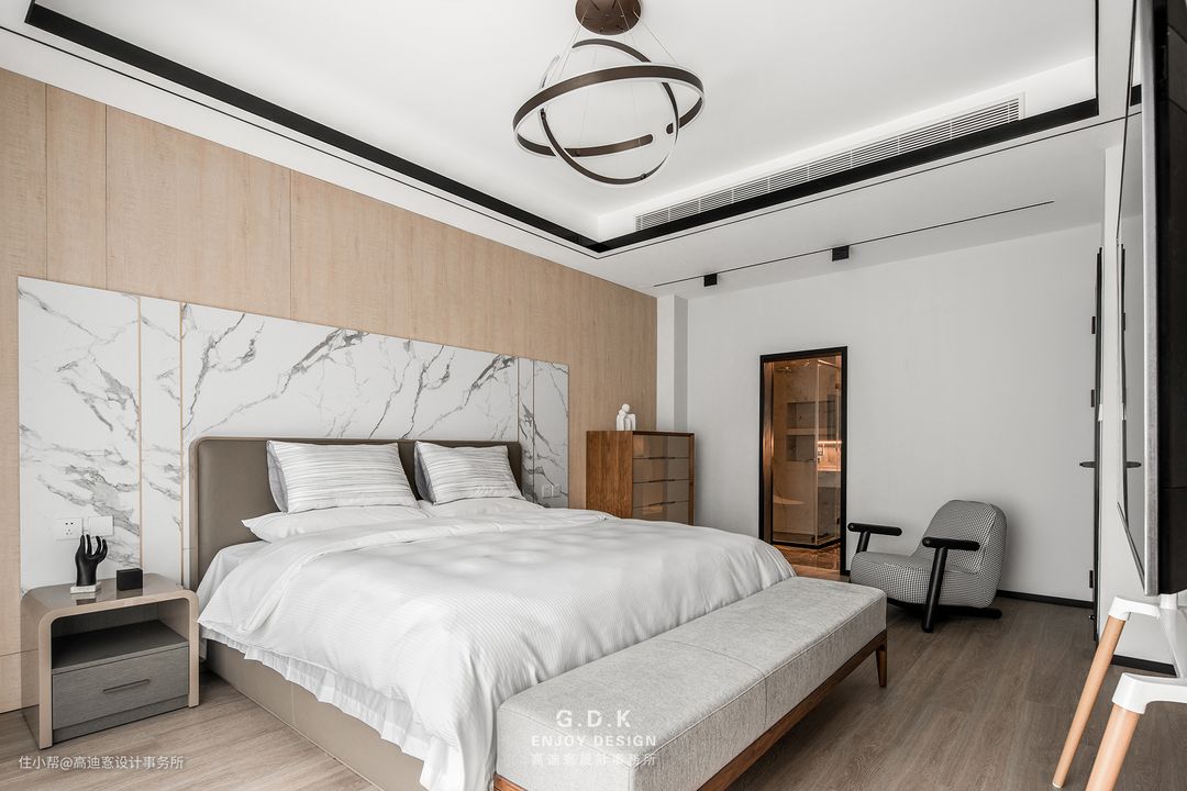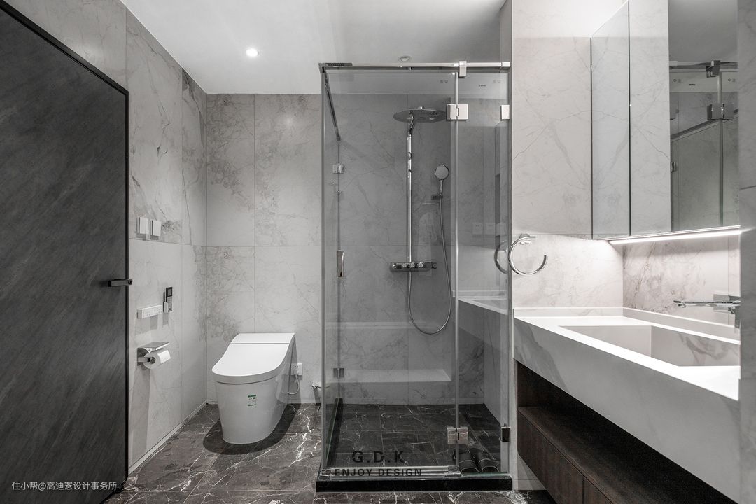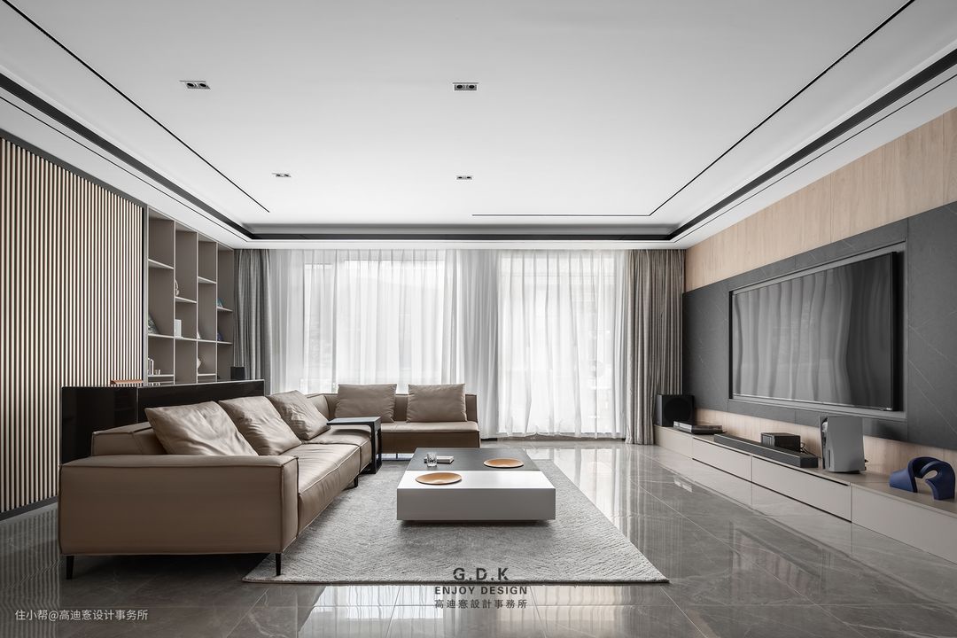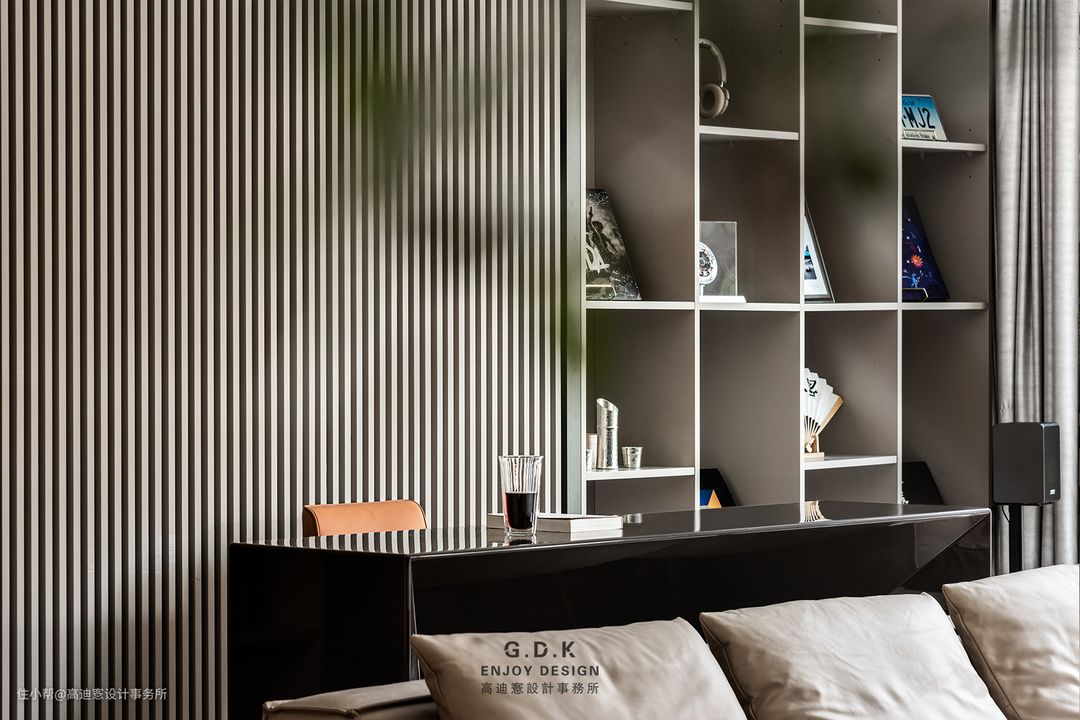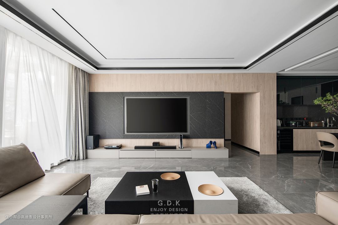 空间以经典的黑白灰系作为主题配色,通过平衡三者之间的面积比例,配合玻璃、石材、原木、皮革等材质丰富层次,打磨出家的质感。
