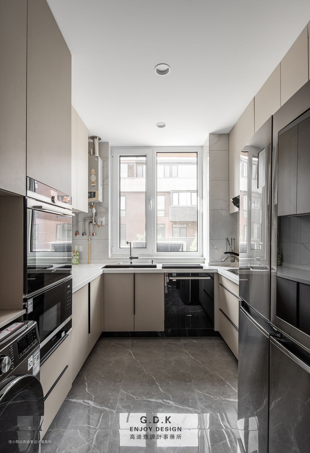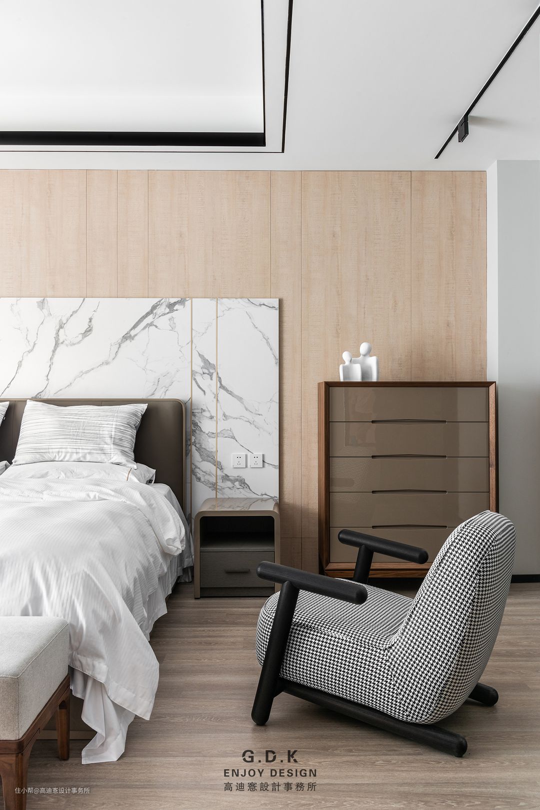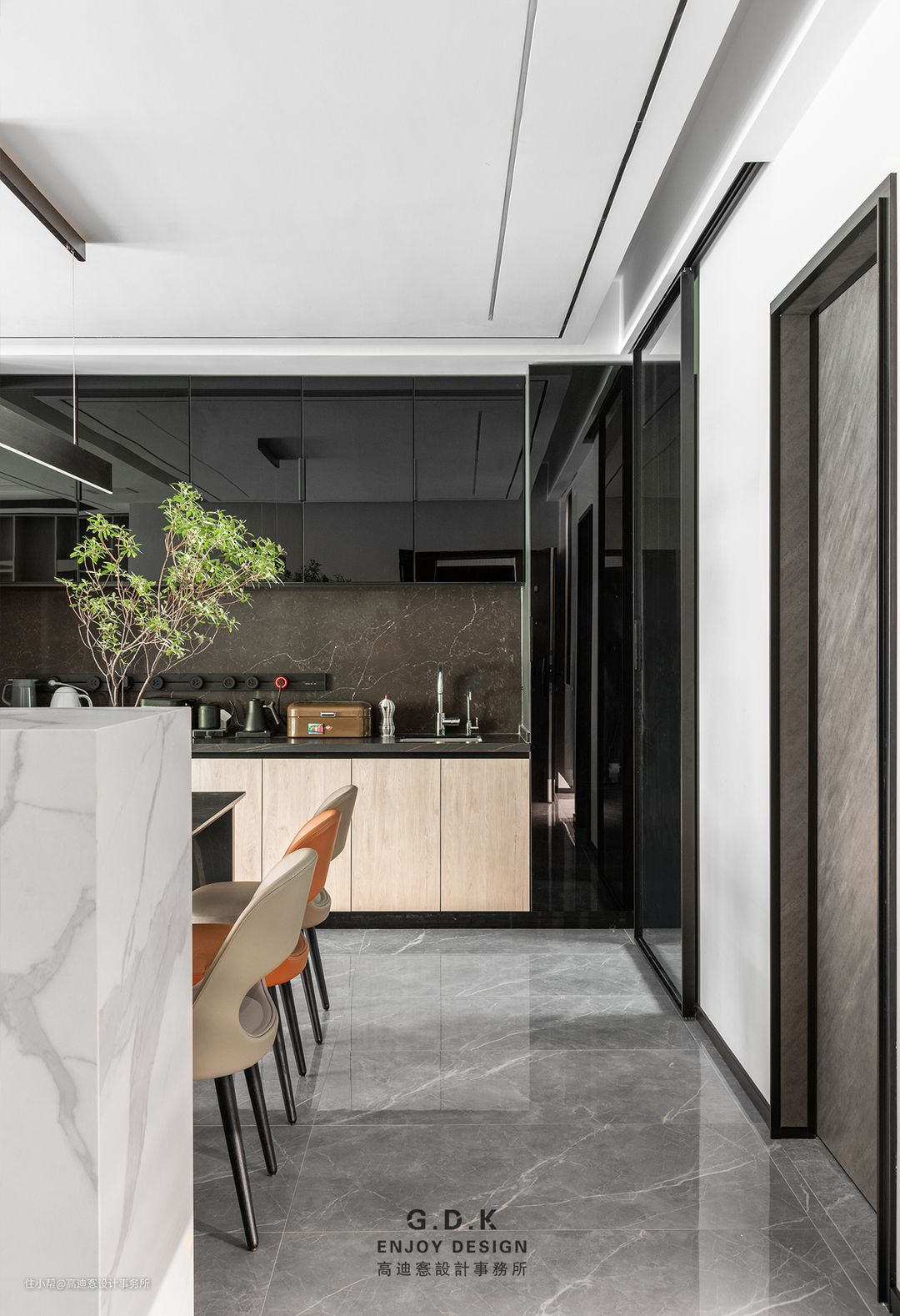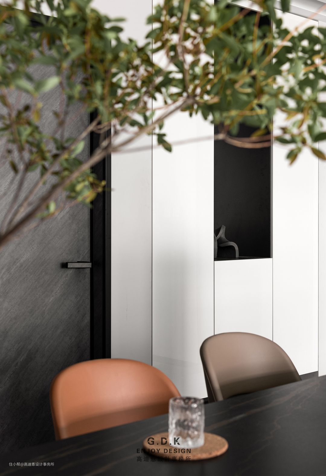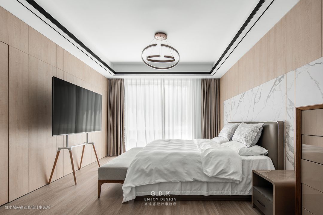 空间以经典的黑白灰系作为主题配色,通过平衡三者之间的面积比例,配合玻璃、石材、原木、皮革等材质丰富层次,打磨出家的质感。