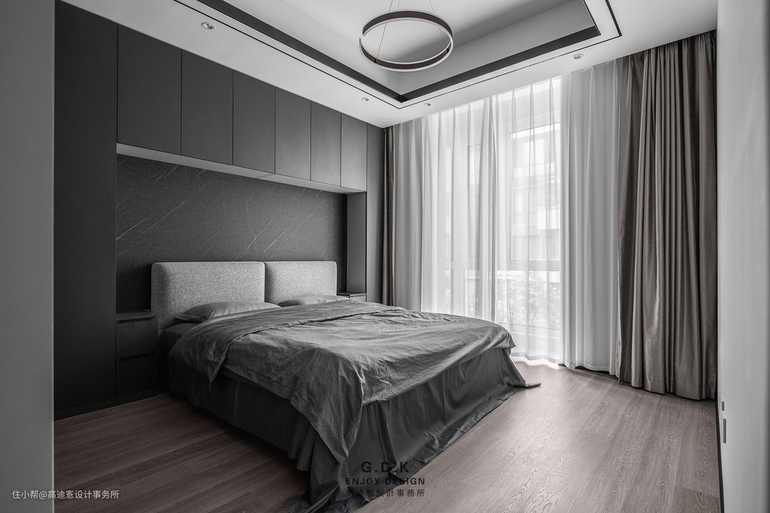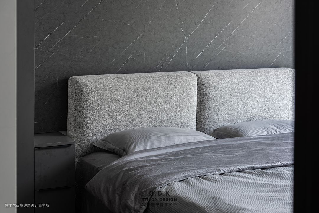 次卧以不同明度的灰,逐层递进,营造一种静谧舒适的氛围。