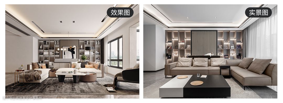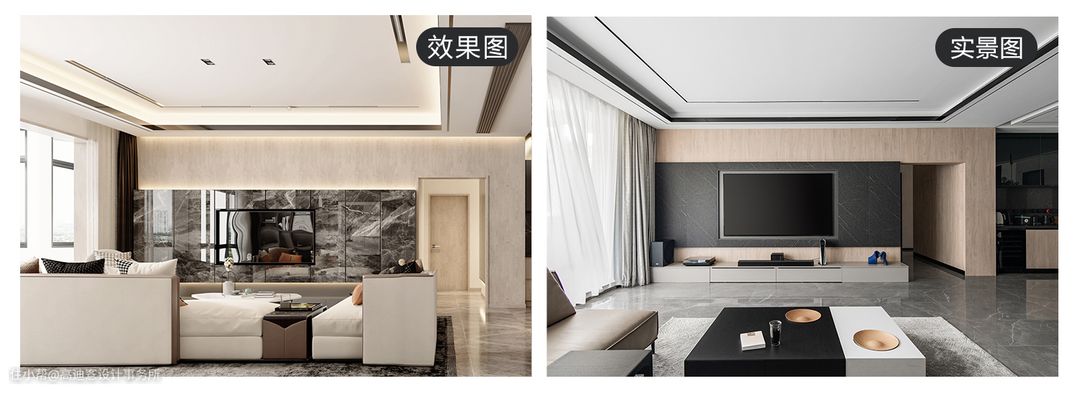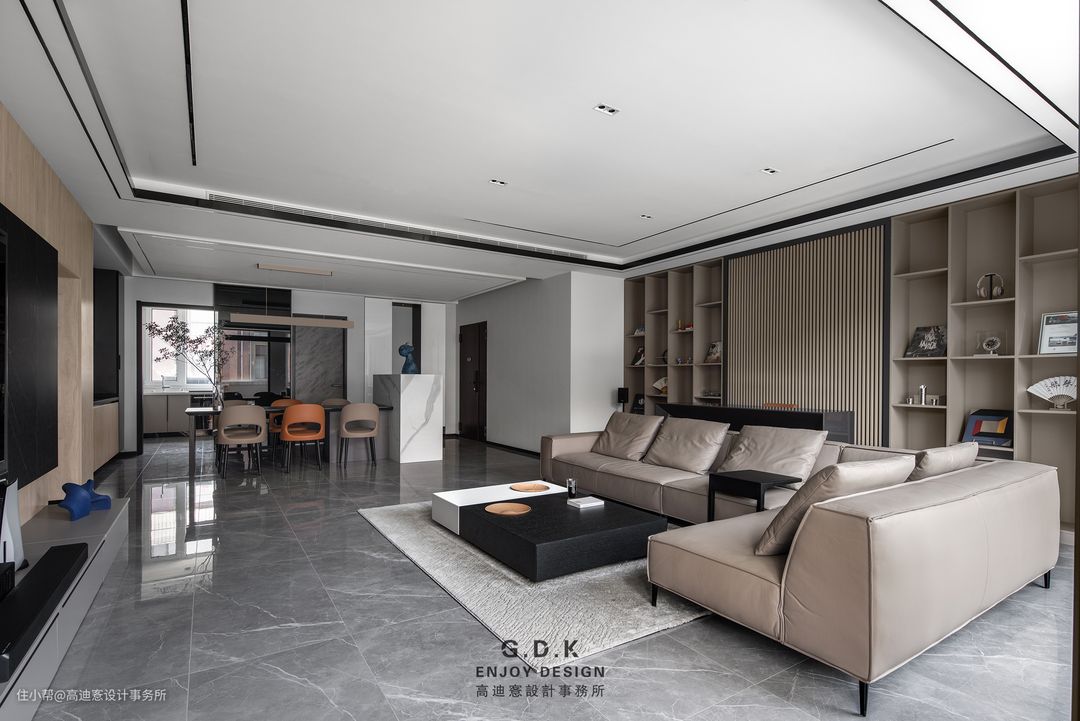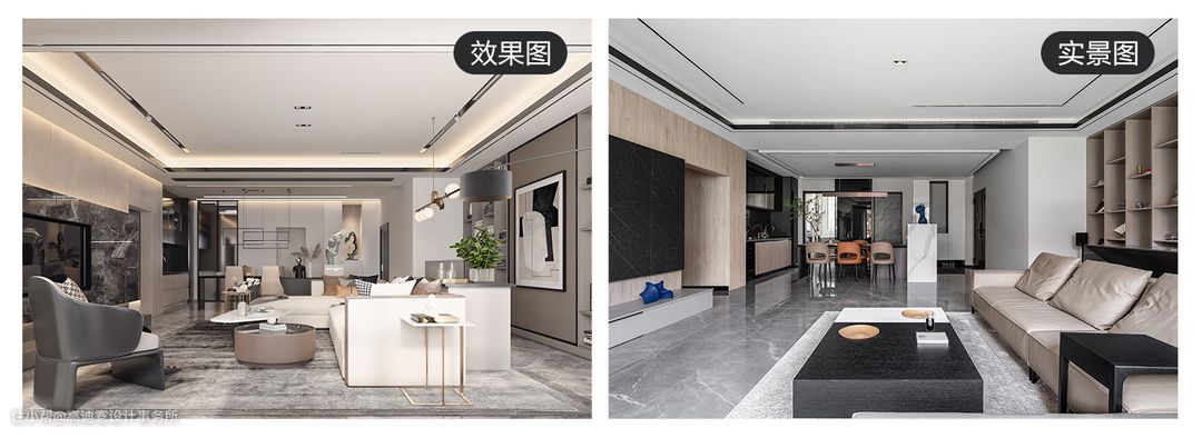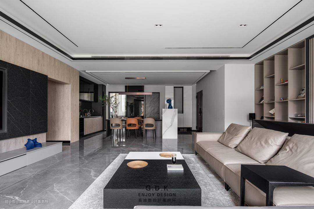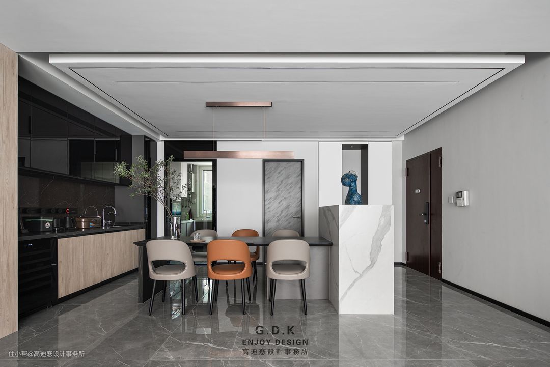 客餐厅在区块上是一个视觉整体,而顶面的分级吊顶是分区细节。确保空间连贯性的同时重视室内分区过渡的潜在心理转换,从而提升整体舒适度。