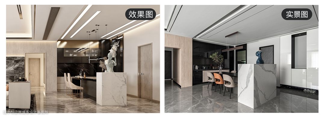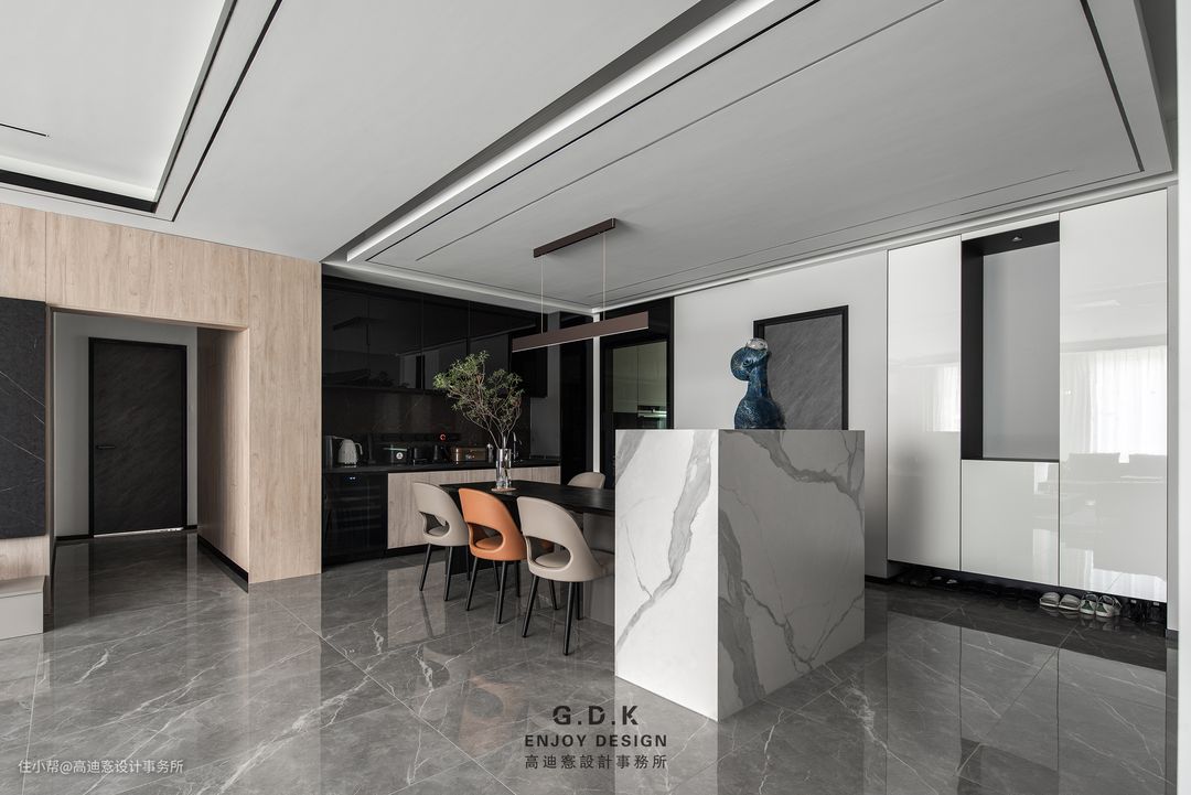 正对入户是一处高1.3m的端景设计,作餐区与玄关区的软分割,保证空间开阔的同时在视觉上起到过渡缓冲的作用。