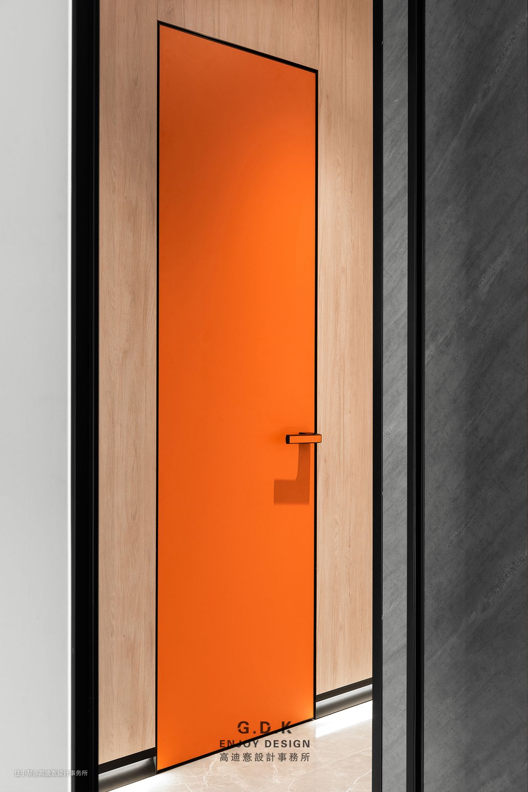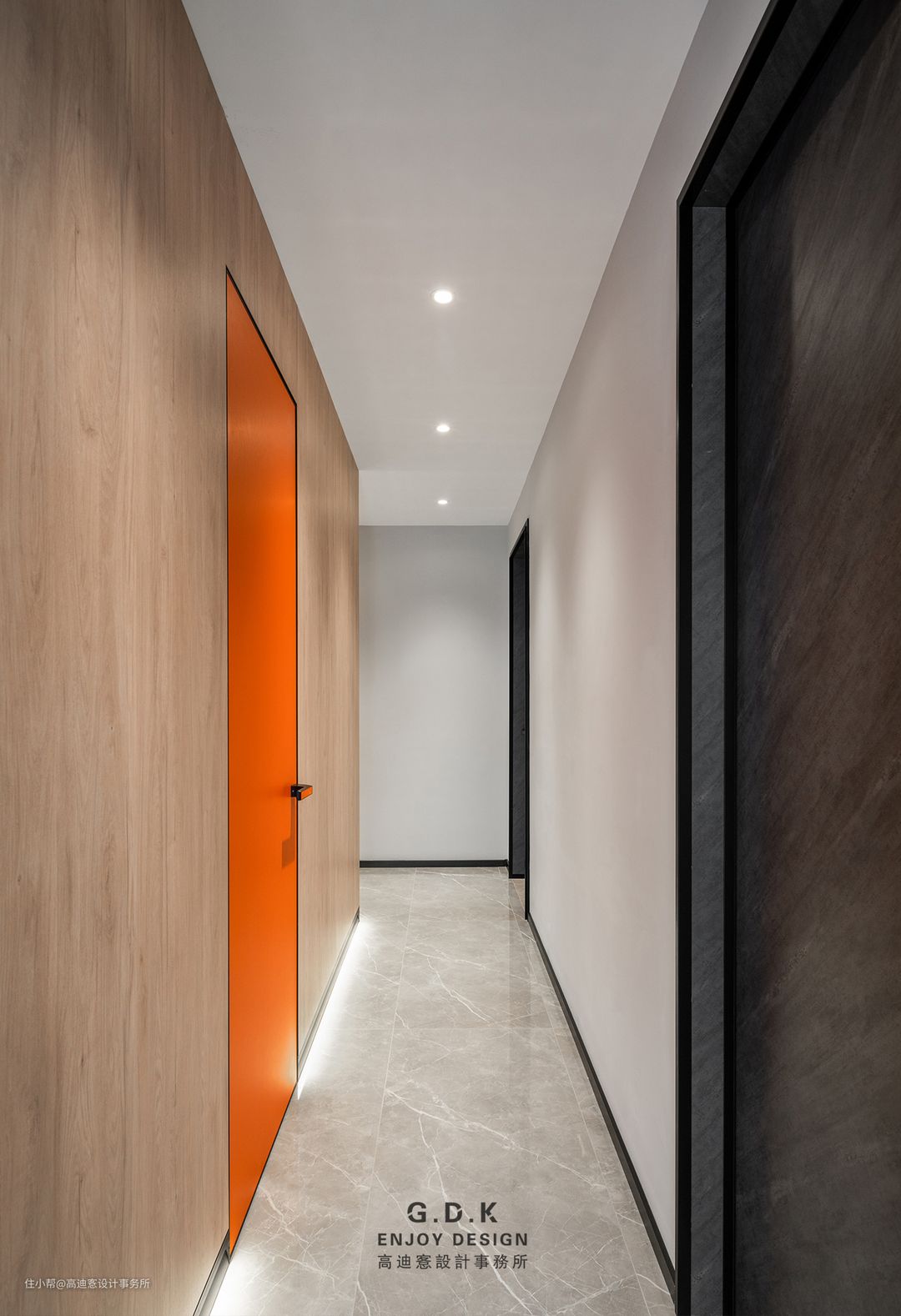 过道同样采用了原木的饰面,保证了与其他区域的连贯。而橙色的加入又让原本平淡空间跳脱出来,增加新鲜感。