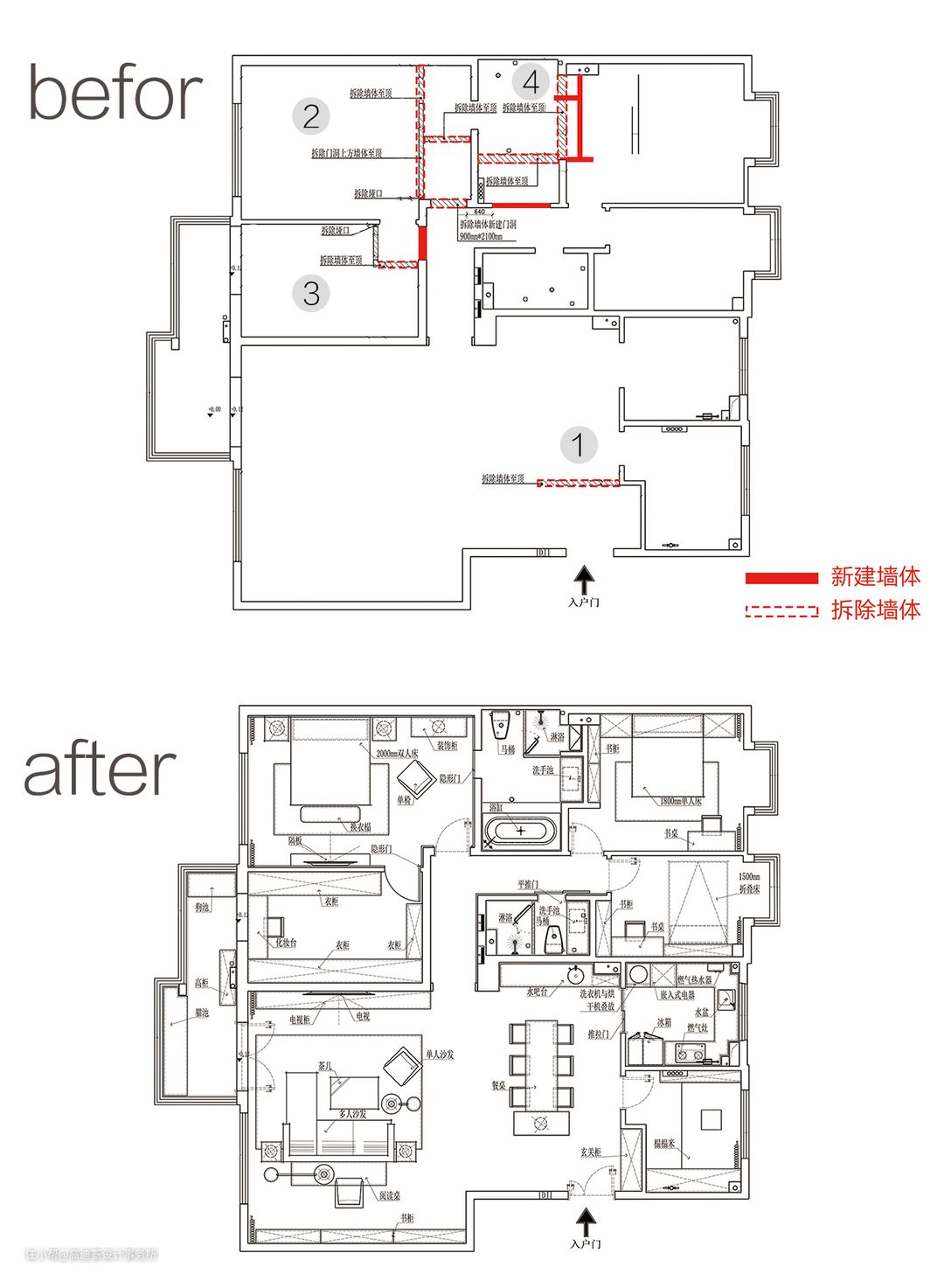 户型分析: ① 拆除原入户位置的墙体,将空间打开,让客餐区域更通透舒展,设置高度1.3m的端景台面,作玄关区域软分割。 ② 扩大主卧面积,原较小的衣帽间纳入主卧休息区 ③ 将小次卧改成衣帽间,与主卧打通 ④ 主卫生间重新规整,纳入储藏间增加浴缸