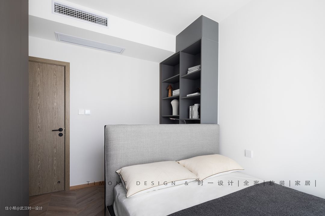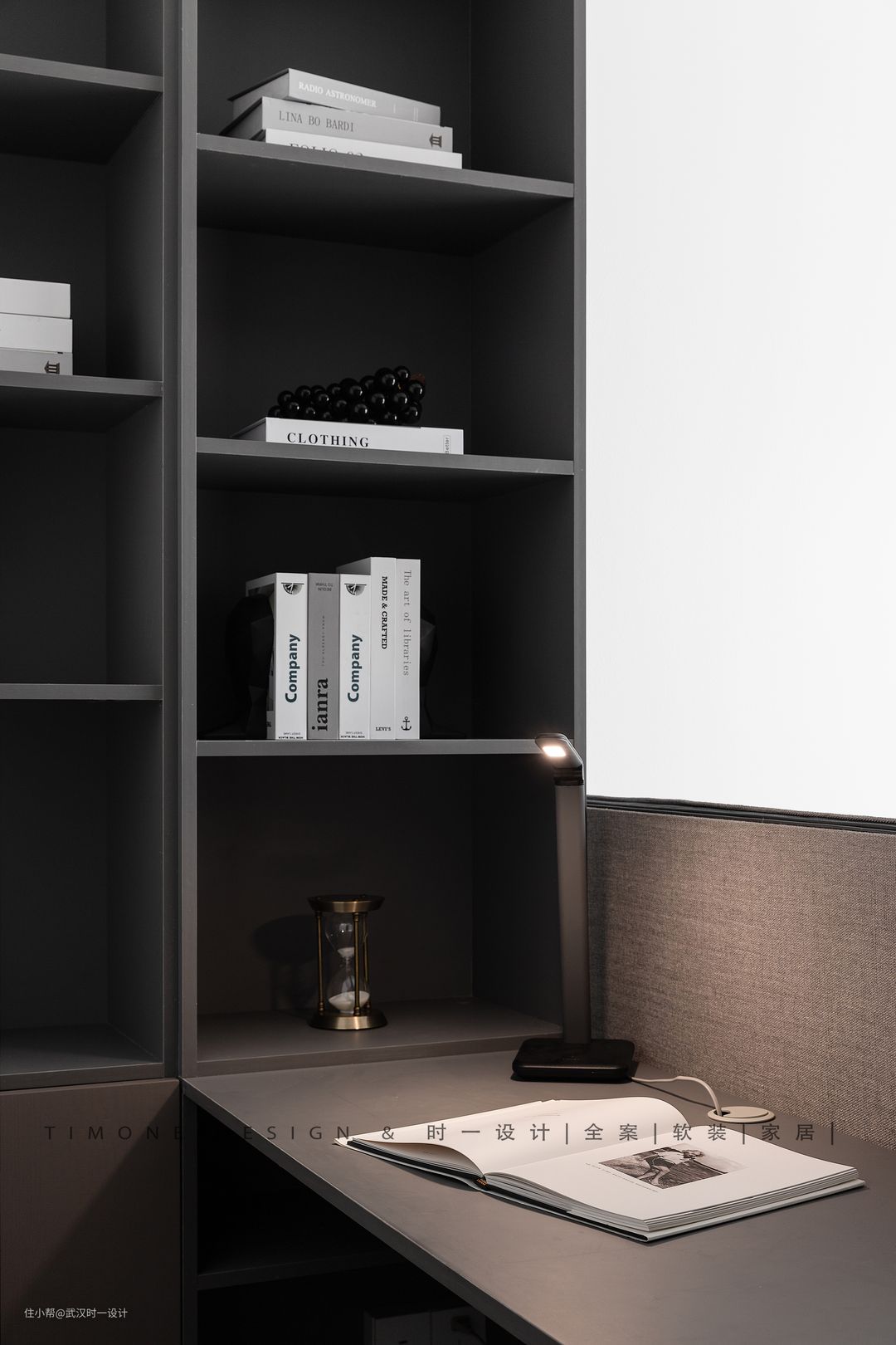 ❑ 书房与卧室完美结合,背靠书桌,形成空间区分,灰色系的书桌搭配随处散落的木质细纹显得意外和谐。