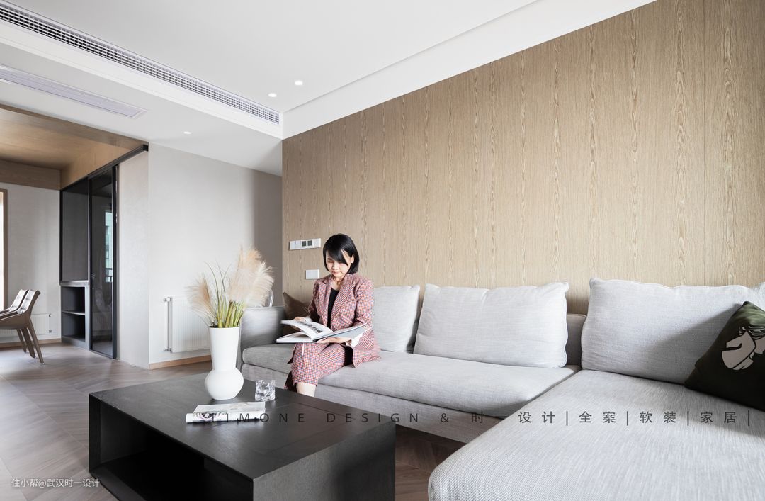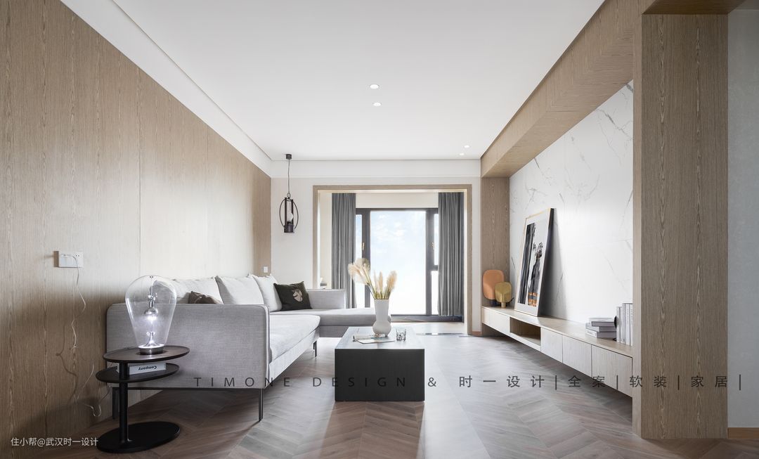 木色的墙板与浅灰色的布艺沙发搭配,整个空间充斥着一种轻松感,而黑橡木的茶几又使空间多一些稳重感。