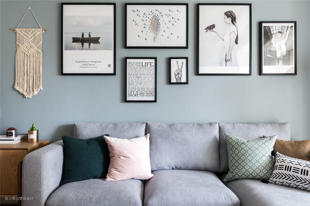 ▼蓝绿色与灰色相撞划分领地,沙发背景墙以自然之色-蓝绿色的墙面营造一片自然之景,墙面运用简约的挂画做装饰,黑色边框奠定了北欧基调。灰色三人转角沙发,原木色垫底,黑色的圆角站稳根基,配搭墨绿色、粉色和蓝色抱枕活跃气氛。此时的北欧已然丢弃了性冷淡的绰号,回归到一种更自然更有温度的北欧风情之中。