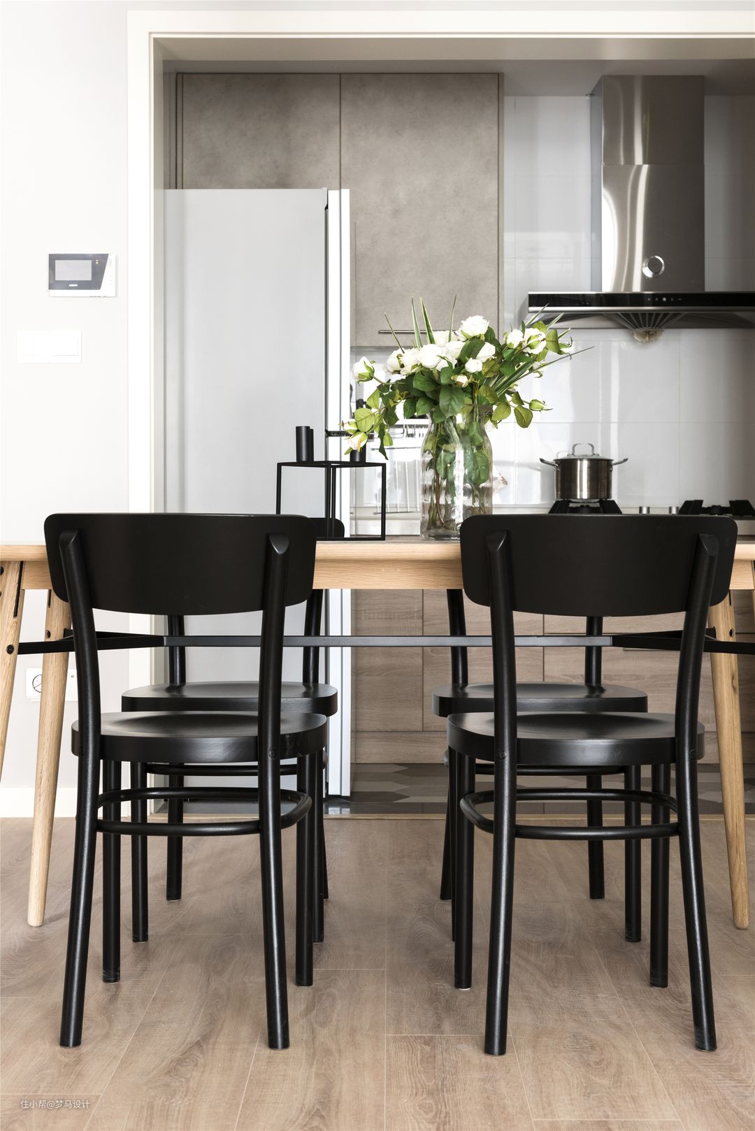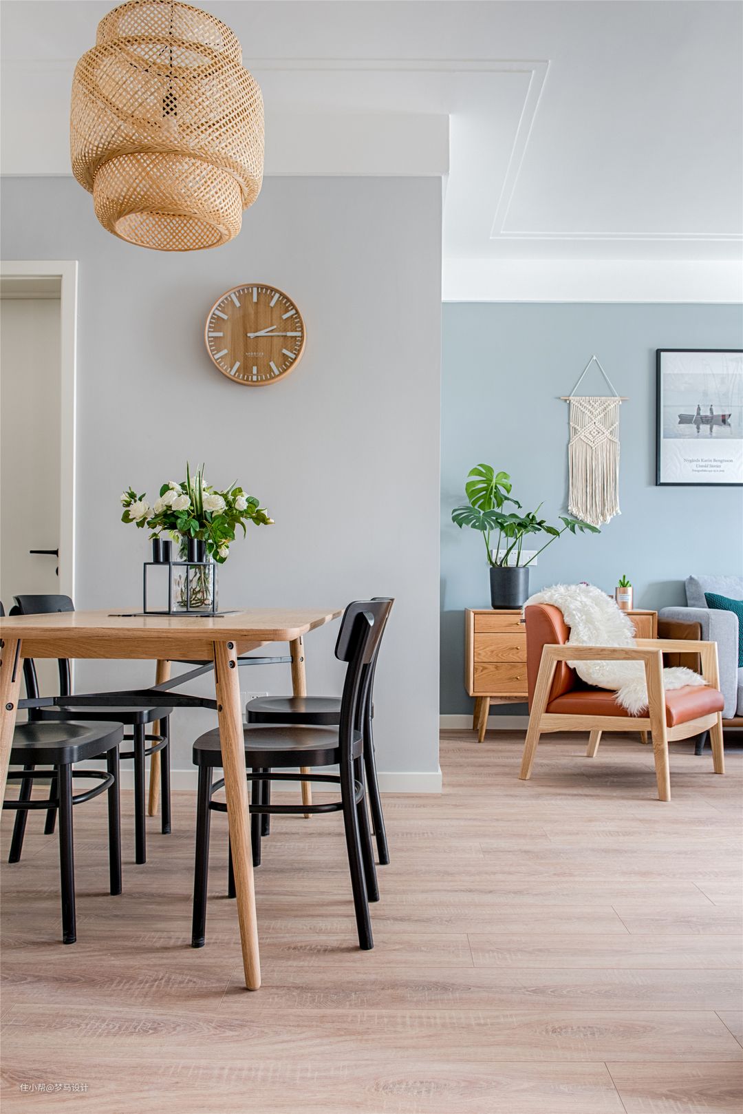 ▼连着半开放式厨房的客餐厅,让整个空间更加的开阔,家人朋友的交流互动不仅限于客厅,能够从厨房、餐厅再到客厅。 餐厅区域以白色和灰色为基调,原木色和黑色家具装饰色彩。 原木餐桌配上全黑色餐椅,静坐于此等待味蕾的觉醒,竹编吊灯发散着温暖的光,点亮了嘀嗒嘀嗒的时间,温暖着咕咕作响的胃。在这样一个空间里就餐,似清风徐徐地吹着发丝,似暖阳照在身上舒舒麻麻,神清气爽。